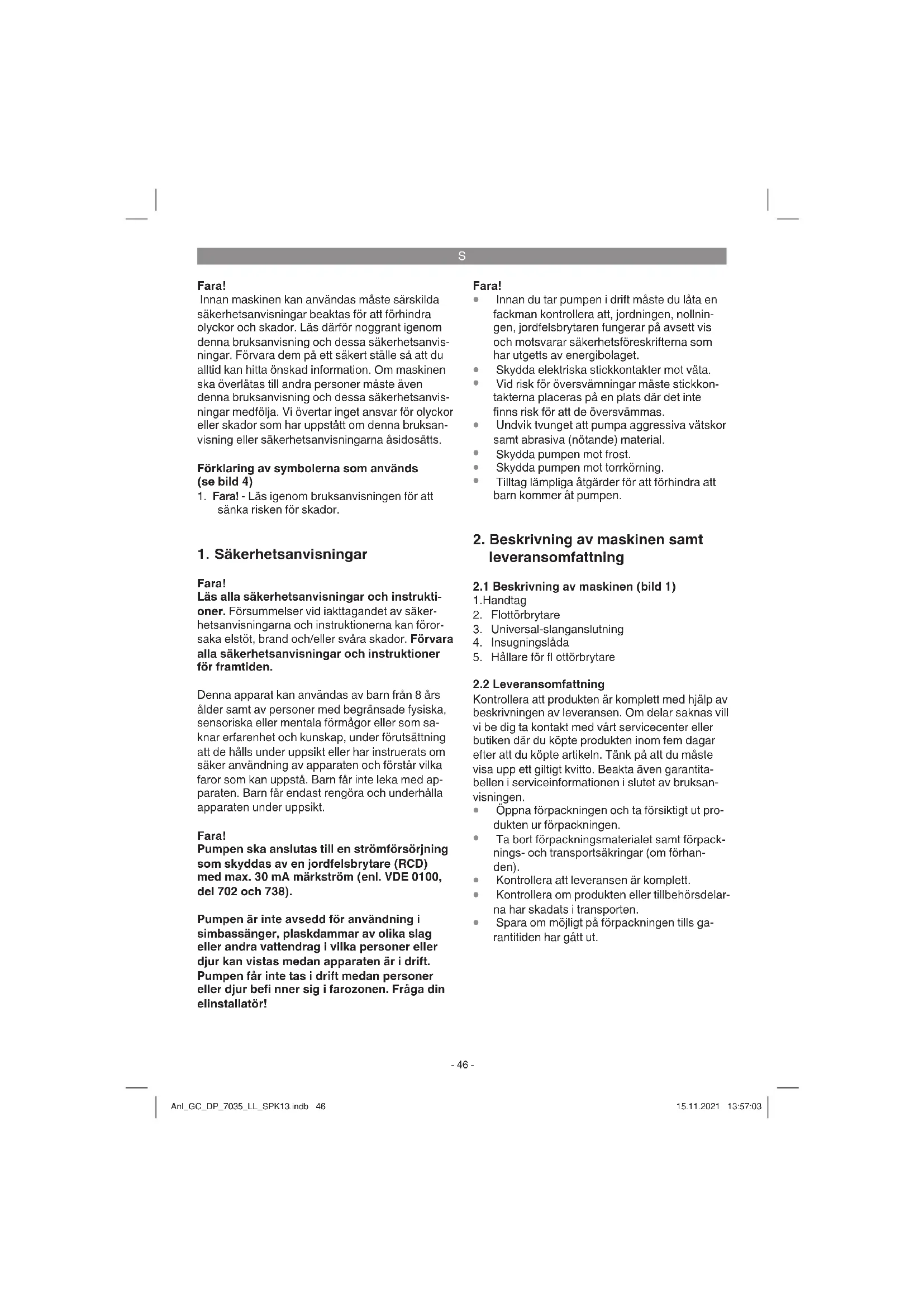Fara! Läs alla säkerhetsanvisningar och instrukti- oner. Försummelser vid iakttagandet av säker- hetsanvisningarna och instruktionerna kan föror- saka elstöt, brand och/eller svåra skador. Förvara alla säkerhetsanvisningar och instruktioner för framtiden. Denna apparat kan användas av barn från 8 års ålder samt av personer med begränsade fysiska, sensoriska eller mentala förmågor eller som sa- knar erfarenhet och kunskap, under förutsättning att de hålls under uppsikt eller har instruerats om säker användning av apparaten och förstår vilka faror som kan uppstå. Barn får inte leka med ap- paraten. Barn får endast rengöra och underhålla apparaten under uppsikt. Fara! Pumpen ska anslutas till en strömförsörjning som skyddas av en jordfelsbrytare (RCD) med max. 30 mA märkström (enl. VDE 0100, del 702 och 738). Pumpen är inte avsedd för användning i simbassänger, plaskdammar av olika slag eller andra vattendrag i vilka personer eller djur kan vistas medan apparaten är i drift. Pumpen får inte tas i drift medan personer eller djur befi nner sig i farozonen. Fråga din elinstallatör! Fara!