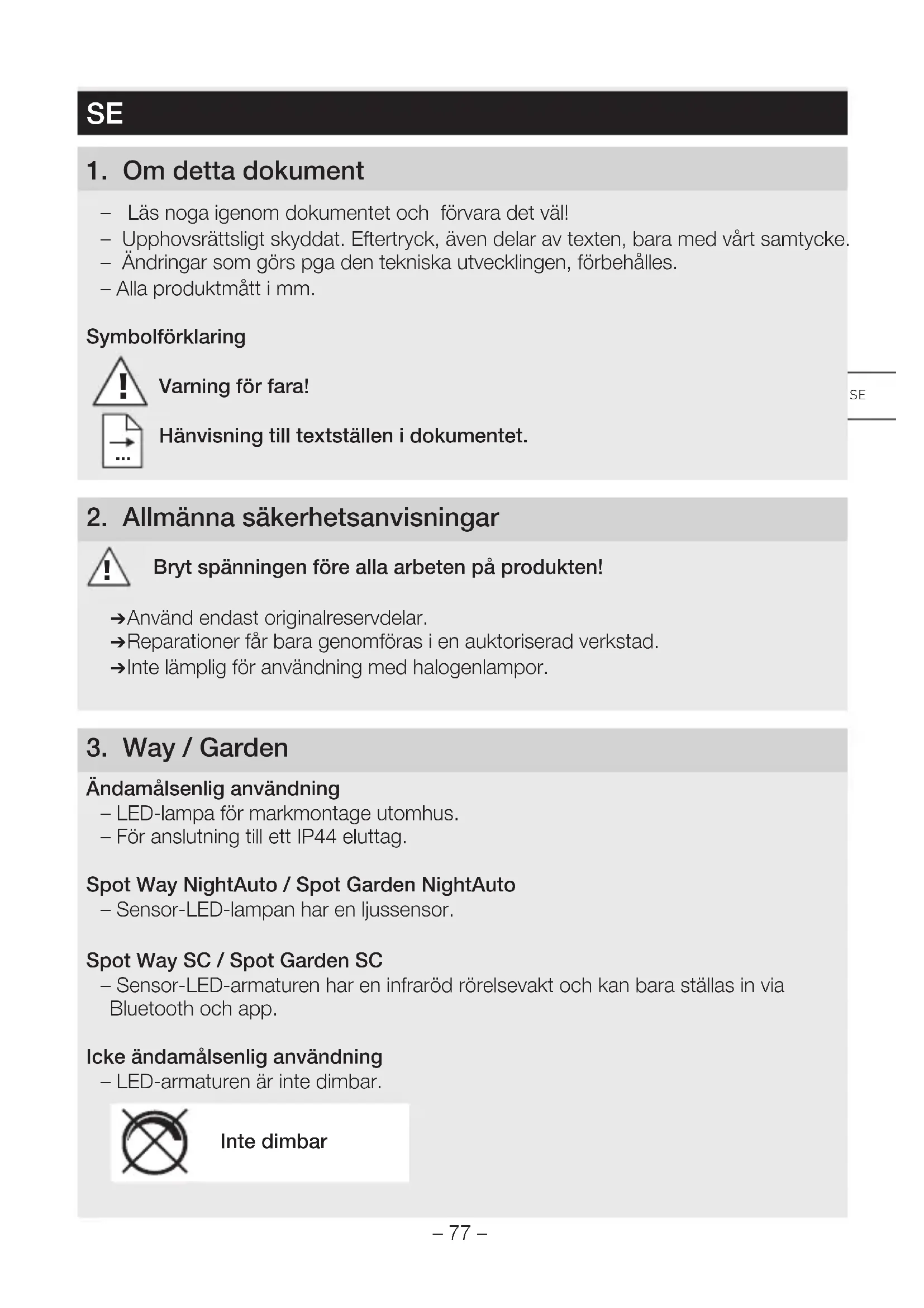 Ändamålsenlig användning – LED-lampa för markmontage utomhus. – För anslutning till ett IP44 eluttag. Spot Way NightAuto/Spot Garden NightAuto – Sensor-LED-lampan har en ljussensor. Spot Way SC/Spot Garden SC – Sensor-LED-armaturen har en infraröd rörelsevakt och kan bara ställas in via Bluetooth och app. Icke ändamålsenlig användning – LED-armaturen är inte dimbar. Inte dimbar SE– 78 – Innehåll Spot Way (Bild 3.1) – Lampa inkl. stativ, bottenplatta och anslutningskabel med nätkontakt – Tre skruvar – Tre pluggar Innehåll Spot Garden (Bild 3.2) – Lampa inkl. anslutningskabel med nätkontakt – Jordspett – Två skruvar Produktmått Spot Way (Bild 3.3) Produktmått Spot Garden (Bild 3.4) Produktöversikt (Bild 3.5 – 3.10) A Lampkupa B Rörelsevakt (endast Spot Way / Spot Garden SC) C Ljussensor (endast Spot Way/Garden NightAuto) D Skymningsinställning (endast Spot Way/Garden NightAuto) E Stativ med bottenplatta (endast Spot Way) F Jordspett (endast Spot Garden) G Nätkabel med kontakt Bevakningsområde Spot Way / Spot Garden SC (Bild 3.11 – 3.16) Ljusintensitetsfördelning (Bild 3.17)