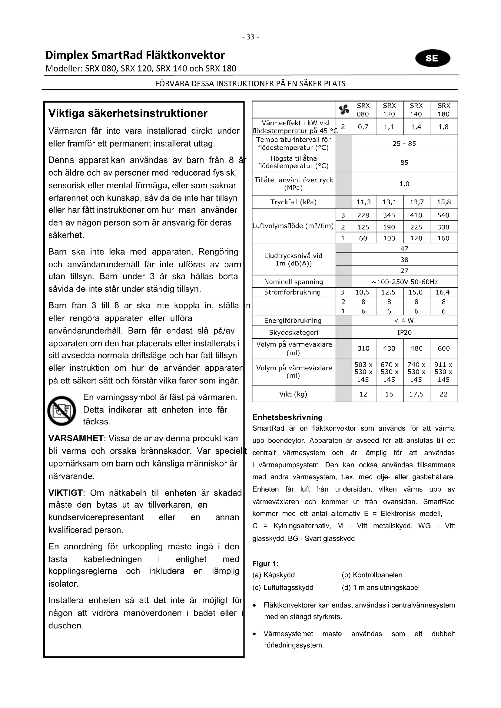 Dimplex SmartRad Fläktkonvektor Modeller: SRX 080, SRX 120, SRX 140 och SRX 180 FÖRVARA DESSA INSTRUKTIONER PÅ EN SÄKER PLATS SRX