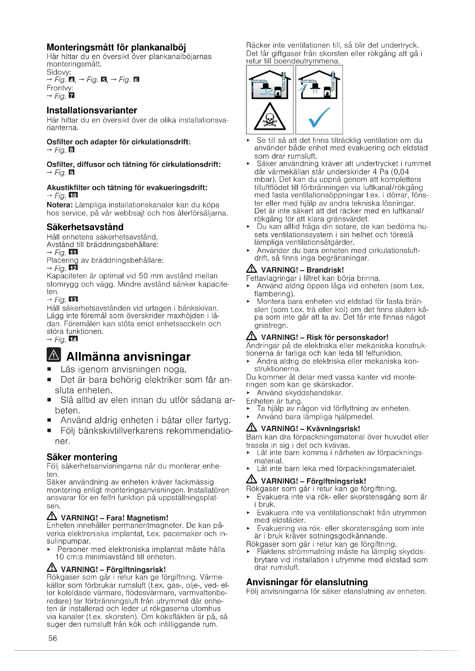 Allmänna anvisningar ¡ Läs igenom anvisningen noga. ¡ Det är bara behörig elektriker som får an- sluta enheten. ¡ Slå alltid av elen innan du utför sådana ar- beten. ¡ Använd aldrig enheten i båtar eller fartyg. ¡ Följ bänkskivtillverkarens rekommendatio- ner. Säker montering Följ säkerhetsanvisningarna när du monterar enhe- ten. Säker användning av enheten kräver fackmässig montering enligt monteringsanvisningen. Installatören ansvarar för en felfri funktion på uppställningsplat- sen. VARNING!‒Fara! Magnetism! Enheten innehåller permanentmagneter. De kan på- verka elektroniska implantat, t.ex. pacemaker och in- sulinpumpar. ▶ Personer med elektroniska implantat måste hålla 10cm:s minimiavstånd till enheten. VARNING!‒Förgiftningsrisk! Rökgaser som går i retur kan ge förgiftning. Värme- källor som förbrukar rumsluft (t.ex. gas-, olje-, ved- el- ler koleldade värmare, flödesvärmare, varmvattenbe- redare) tar förbränningsluft från utrymmet där enhe- ten är installerad och leder ut rökgaserna utomhus via kanaler (t.ex. skorsten). Om köksfläkten är på, så suger den rumsluft från kök och intilliggande rum. Räcker inte ventilationen till, så blir det undertryck. Det får giftgaser från skorsten eller rökgång att gå i retur till boendeutrymmena. ▶ Se till så att det finns tillräcklig ventilation om du använder både enhet med evakuering och eldstad som drar rumsluft. ▶ Säker användning kräver att undertrycket i rummet där värmekällan står underskrider 4 Pa (0,04 mbar). Det kan du uppnå genom att komplettera tilluftflödet till förbränningen via luftkanal/rökgång med fasta ventilationsöppningar t.ex. i dörrar, föns- ter eller med hjälp av andra tekniska lösningar. Det är inte säkert att det räcker med en luftkanal/ rökgång för att klara gränsvärdet. ▶ Du kan alltid fråga din sotare, de kan bedöma hu- sets ventilationssystem i sin helhet och föreslå lämpliga ventilationsåtgärder. ▶ Använder du bara enheten med cirkulationsluft- drift, så finns inga begränsningar. VARNING!‒Brandrisk! Fettavlagringar i filtret kan börja brinna. ▶ Använd aldrig öppen låga vid enheten (som t.ex. flambering). ▶ Montera bara enheten vid eldstad för fasta brän- slen (som t.ex. trä eller kol) om det finns sluten kå- pa som inte går att ta av. Det får inte finnas något gnistregn. VARNING!‒Risk för personskador! Ändringar på de elektriska eller mekaniska konstruk- tionerna är farliga och kan leda till felfunktion. ▶ Ändra aldrig de elektriska eller mekaniska kon- struktionerna. Du kommer åt delar med vassa kanter vid monte- ringen som kan ge skärskador. ▶ Använd skyddshandskar. Enheten är tung. ▶ Ta hjälp av någon vid förflyttning av enheten. ▶ Använd bara lämpliga hjälpmedel. VARNING!‒Kvävningsrisk! Barn kan dra förpackningsmaterial över huvudet eller trassla in sig i det och kvävas. ▶ Låt inte barn komma i närheten av förpacknings- material. ▶ Låt inte barn leka med förpackningsmaterialet. VARNING!‒Förgiftningsrisk! Rökgaser som går i retur kan ge förgiftning. ▶ Evakuera inte via rök- eller skorstensgång som är i bruk. ▶ Evakuera inte via ventilationschakt från utrymmen med eldstäder. ▶ Evakuering via rök- eller skorstensgång som inte är i bruk kräver sotningsgodkännande. Rökgaser som går i retur kan ge förgiftning. ▶ Fläktens strömmatning måste ha lämplig skydds- brytare vid installation i utrymme med eldstad som drar rumsluft. Anvisningar för elanslutning Följ anvisningarna för säker elanslutning av enheten.57 VARNING!‒Risk för elstötar! Det måste alltid gå att göra enheten strömlös. Du får bara ansluta enheten till rätt installerad kopplingsdo- sa. ▶ Den fasta installationen måste ha allpolig brytare som uppfyller kraven enligt överspänningskategori III och är monterad enligt föreskrifterna. ▶ Det är bara behörig elektriker som får göra fast anslutning. Vi rekommenderar att du installerar en jordfelsbrytare (FI-brytare) på matningen till enhe- ten. ¡ Se till så att sladden inte blir vikt eller klämd och håll den borta från vassa kanter. ¡ Dra sladden så att den inte kommer i kontakt med enhetens heta hölje. ¡ Använd bara den sladd som medföljer enheten el- ler som service levererat. ¡ Enheten uppfyller kraven enligt EU:s bestämmel- ser för radioavstörning. ¡ Enheten har skyddsklass 1 och ska ha jordad elanslutning vid användning. ¡ Tillverkaren tar inget ansvar för driftstörningar eller ev. skador som beror på felaktig elinstallation. Förbereda elanslutningen Krav:Det är bara utbildad servicetekniker som får arbeta inuti enheten och byta sladd.