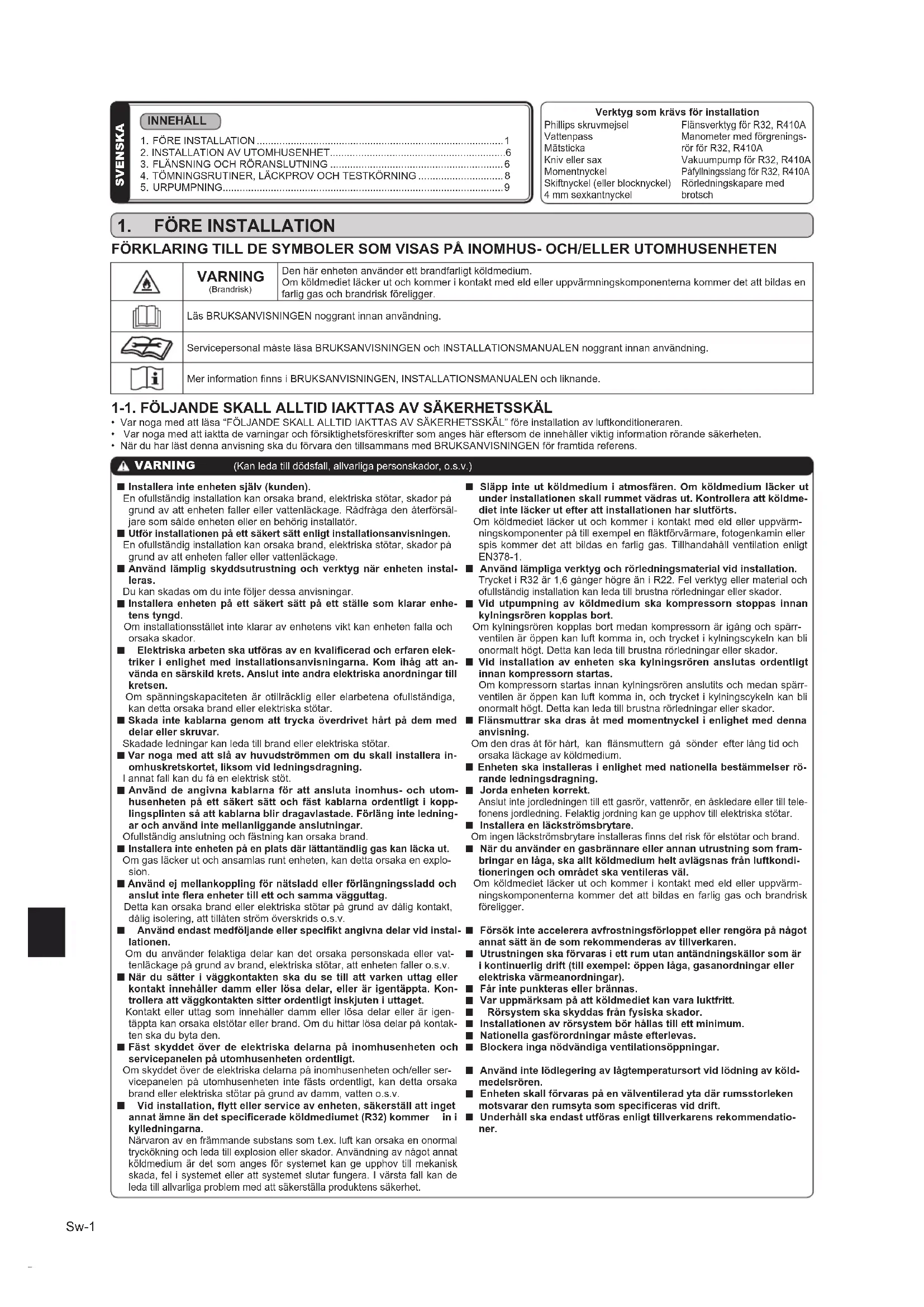 VARNING (Brandrisk) Den här enheten använder ett brandfarligt köldmedium. Om köldmediet läcker ut och kommer i kontakt med eld eller uppvärmningskomponenterna kommer det att bildas en farlig gas och brandrisk föreligger. Läs BRUKSANVISNINGEN noggrant innan användning. Servicepersonal måste läsa BRUKSANVISNINGEN och INSTALLATIONSMANUALEN noggrant innan användning. Mer information nns i BRUKSANVISNINGEN, INSTALLATIONSMANUALEN och liknande.