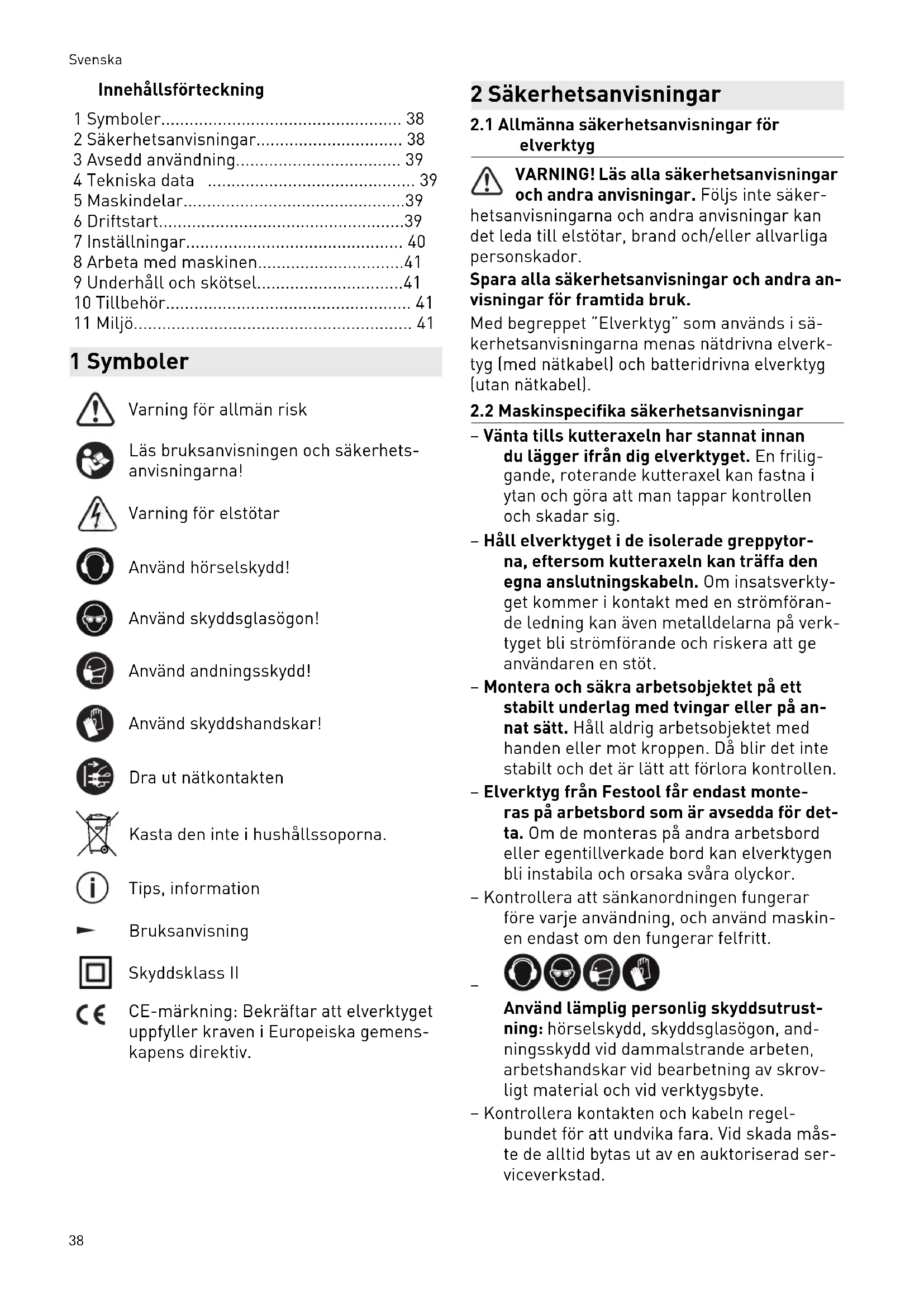 - 11 Miljö 1 Symboler Varning för allmän risk Läs bruksanvisningen och säkerhets anvisningarna! Varning för elstötar Använd hörselskydd! Använd skyddsglasögon! Använd andningsskydd! Använd skyddshandskar! Dra ut nätkontakten Kasta den inte i hushållssoporna. Tips, information Bruksanvisning Skyddsklass II CE-märkning: Bekräftar att elverktyget uppfyller kraven i Europeiska gemens kapens direktiv. 2 Säkerhetsanvisningar p. 41