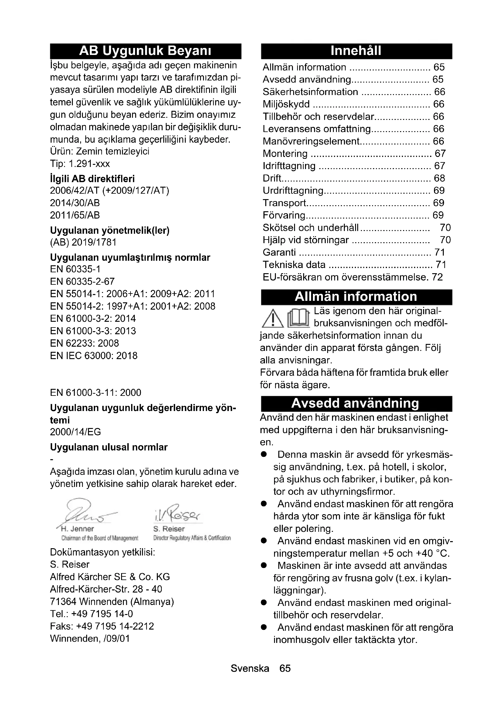 - Aşağıda imzası olan, yönetim kurulu adına ve yönetim yetkisine sahip olarak hareket eder. Dokümantasyon yetkilisi: S. Reiser Alfred Kärcher SE & Co. KG Alfred-Kärcher-Str. 28 - 40 71364 Winnenden (Almanya) Tel.: +49 7195 14-0 Faks: +49 7195 14-2212 Winnenden, /09/01 Innehåll Allmän information Läs igenom den här original- bruksanvisningen och medföl- jande säkerhetsinformation innan du använder din apparat första gången. Följ alla anvisningar. Förvara båda häftena för framtida bruk eller för nästa ägare. Avsedd användning Använd den här maskinen endast i enlighet med uppgifterna i den här bruksanvisning- en. Denna maskin är avsedd för yrkesmäs- sig användning, t.ex. på hotell, i skolor, på sjukhus och fabriker, i butiker, på kon- tor och av uthyrningsfirmor. Använd endast maskinen för att rengöra hårda ytor som inte är känsliga för fukt eller polering. Använd endast maskinen vid en omgiv- ningstemperatur mellan +5 och +40 °C. Maskinen är inte avsedd att användas för rengöring av frusna golv (t.ex. i kylan- läggningar). Använd endast maskinen med original- tillbehör och reservdelar. Använd endast maskinen för att rengöra inomhusgolv eller taktäckta ytor. Allmän information p. 65