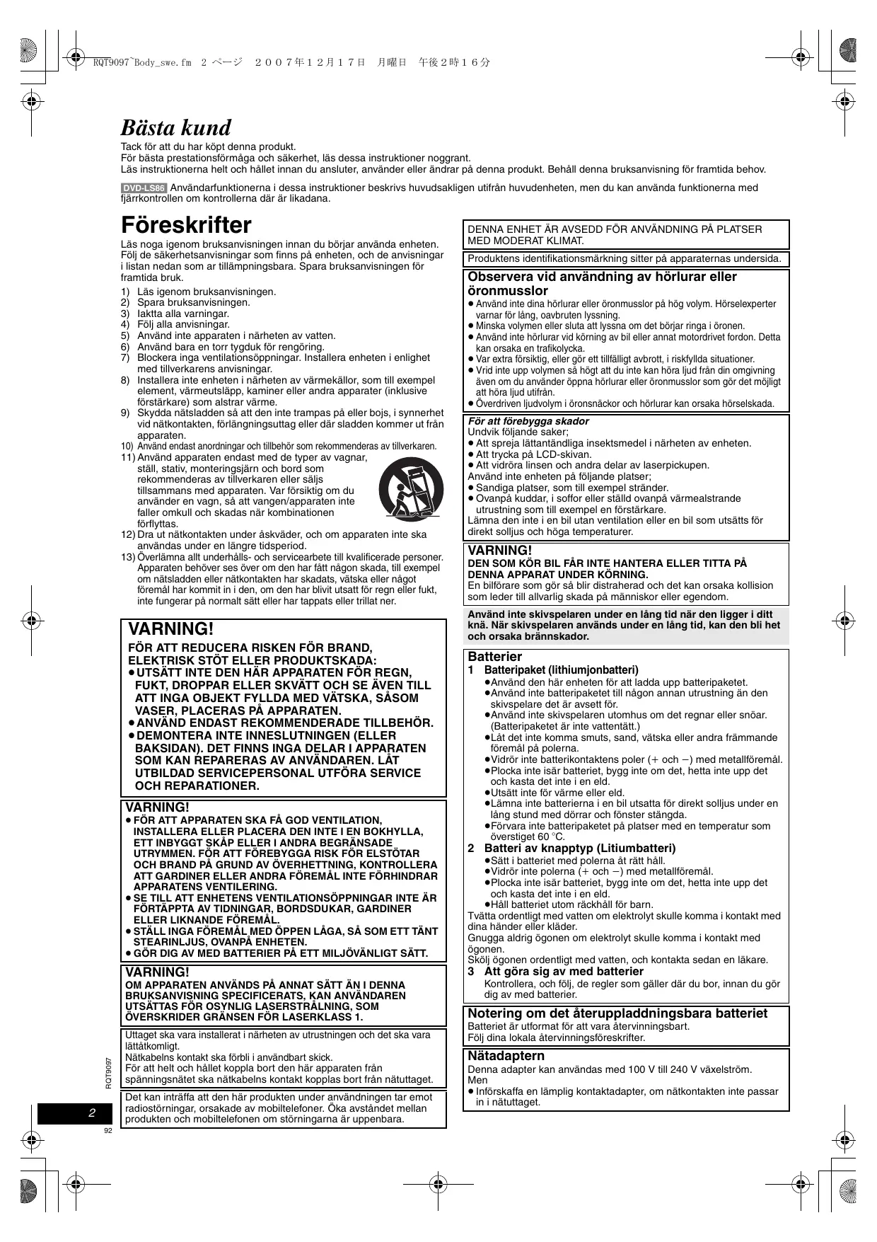 BRUKSANVISNING DVD-LS86 PANASONIC