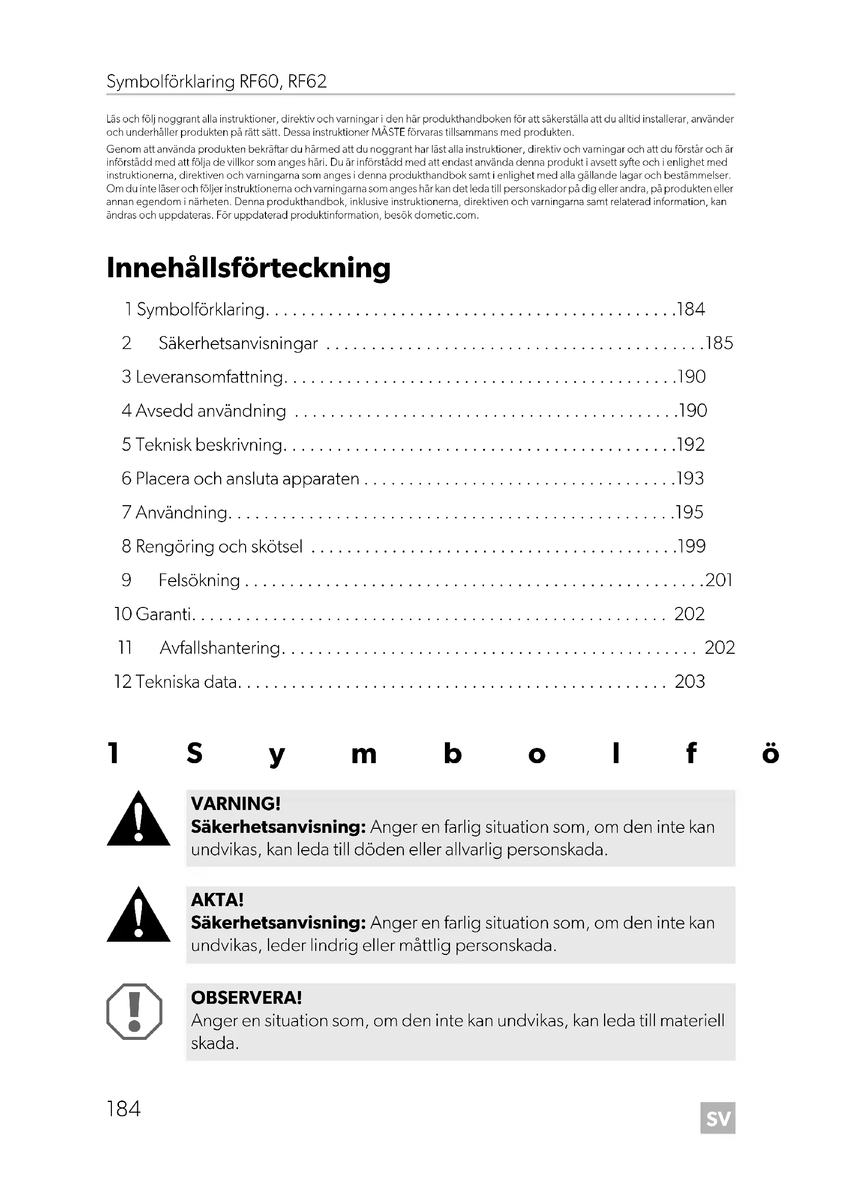 - Läs och följ noggrant alla instruktioner, direktiv och varningar i den här produkthandboken för att säkerställa att du alltid installerar, använder och underhåller produkten på rätt sätt. Dessa instruktioner MÅSTE förvaras tillsammans med produkten. Genom att använda produkten bekräftar du härmed att du noggrant har läst alla instruktioner, direktiv och varningar och att du förstår och är införstådd med att följa de villkor som anges häri. Du är införstådd med att endast använda denna produkt i avsett syfte och i enlighet med instruktionerna, direktiven och varningarna som anges i denna produkthandbok samt i enlighet med alla gällande lagar och bestämmelser. Om du inte läser och följer instruktionerna och varningarna som anges här kan det leda till personskador på dig eller andra, på produkten eller annan egendom i närheten. Denna produkthandbok, inklusive instruktionerna, direktiven och varningarna samt relaterad information, kan ändras och uppdateras. För uppdaterad produktinformation, besök dometic.com. Innehållsförteckning 1 Symbolförklaring p. 184