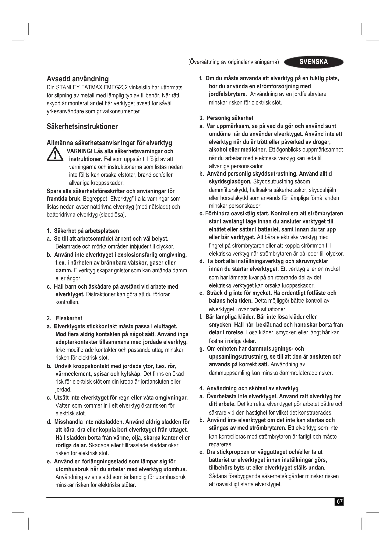 FMEG232 Stanley Europe garanterar att produkterna som beskrivs under "tekniska data" uppfyller: 2006/42/EC, EN 60745-1, EN 60745-2-3 De här produkterna överensstämmer även med direktiven 2004/108/EG och 2011/65/EU. Mer information får du genom att kontakta Stanley Europe på följande adress eller titta i slutet av bruksanvisningen. Undertecknad är ansvarig för sammanställningen av tekniska data och gör denna försäkran för Stanley Europe. Ed Higgins VD - Motordrivna konsumentverktyg STANLEY FATMAX Europe, Egide Walschaertsstraat 14-18, 2800 Mechelen, Belgien 2021-02-01 Garanti Stanley Fat Max är säkra på kvaliteten hos denna produkt och erbjuder kunder 12 månaders garanti från datumet. Denna garanti är ett tillägg till dina lagstadgade rättigheter och påverkar inte dessa på något sätt. Garantin är giltig i de områden som tillhör medlemsstaterna i Europeiska unionen och det europeiska frihandelsområdet. För yrkande under garantin måste yrkandet vara in enlighet med Stanley Fat Max villkor och du kommer att behöva skicka in bevis på köpet till försäljaren eller en auktoriserad reparatör. Villkoren för Stanley Fat Max ettåriga garanti och var du hittar din närmaste auktoriserade reparatör kan erhållas på internet på www.2helpU.com, eller genom att kontakta ditt lokal Stanley Fat Max kontor på adressen som angetts i denna bruksanvisning. Besök vår webbsida www.stanleytools.co.uk/för att registrera din nya Stanley Fat Max-produkt samt för att få information om nya produkter och specialerbjudanden74 (Översättning av originalanvisningarna) SVENSKA Tabell över tillbehör Skyddstyp Tillbehör Beskrivning Montera på slipmaskin Skydd typ 27 Slipskiva med försänkt nav Skydd typ 27 Stödfläns Typ 27-skiva med försänkt nav Låsfläns Slipskivor Slipskivorr med gängad mutter Skydd typ 27 Borstskiva Borstkopp med gängad mutter Skydd typ 27 Slipborste75 (Oversettelse av de opprinnelige instruksjonene) NORSK Tiltenkt bruk STANLEY FATMAX FMEG232 vinkelsliper er designet for å slipe metall ved hjelp av passende typer tilbehør. Når det er utstyrt med egnet beskyttelse er dette verktøyet tiltenkt både fagarbeidere og private brukere. Sikkerhetsinstruksjoner Generelle sikkerhetsadvarsler for elektroverktøy