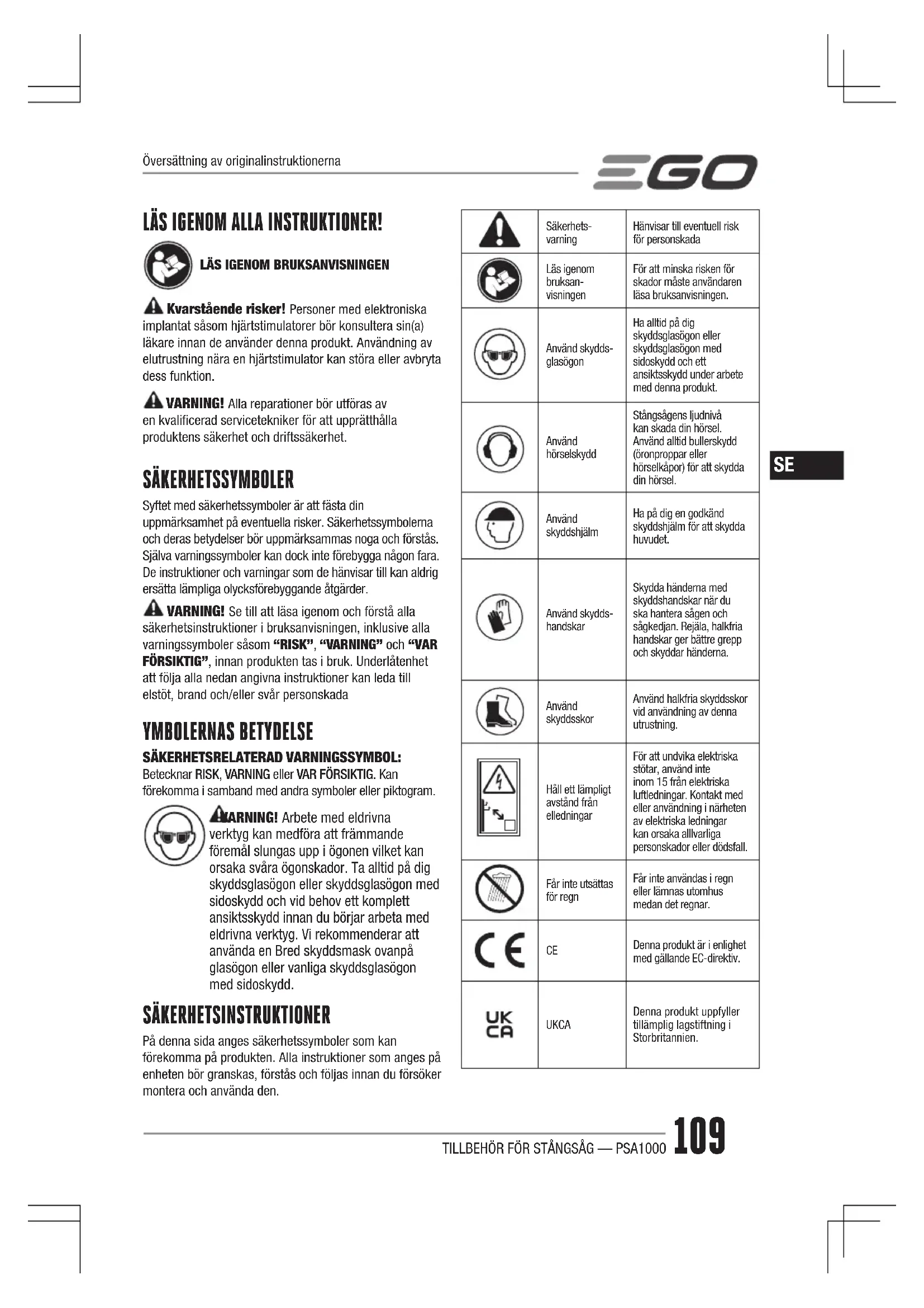 Kvarstående risker! Personer med elektroniska implantat såsom hjärtstimulatorer bör konsultera sin(a) läkare innan de använder denna produkt. Användning av elutrustning nära en hjärtstimulator kan störa eller avbryta dess funktion. VARNING! Alla reparationer bör utföras av en kvalificerad servicetekniker för att upprätthålla produktens säkerhet och driftssäkerhet. SÄKERHETSSYMBOLER Syftet med säkerhetssymboler är att fästa din uppmärksamhet på eventuella risker. Säkerhetssymbolerna och deras betydelser bör uppmärksammas noga och förstås. Själva varningssymboler kan dock inte förebygga någon fara. De instruktioner och varningar som de hänvisar till kan aldrig ersätta lämpliga olycksförebyggande åtgärder. VARNING! Se till att läsa igenom och förstå alla säkerhetsinstruktioner i bruksanvisningen, inklusive alla varningssymboler såsom “RISK”, “VARNING” och “VAR FÖRSIKTIG”, innan produkten tas i bruk. Underlåtenhet att följa alla nedan angivna instruktioner kan leda till elstöt, brand och/eller svår personskada YMBOLERNAS BETYDELSE SÄKERHETSRELATERAD VARNINGSSYMBOL: Betecknar RISK, VARNING eller VAR FÖRSIKTIG. Kan förekomma i samband med andra symboler eller piktogram. VARNING! Arbete med eldrivna verktyg kan medföra att främmande föremål slungas upp i ögonen vilket kan orsaka svåra ögonskador. Ta alltid på dig skyddsglasögon eller skyddsglasögon med sidoskydd och vid behov ett komplett ansiktsskydd innan du börjar arbeta med eldrivna verktyg. Vi rekommenderar att använda en Bred skyddsmask ovanpå glasögon eller vanliga skyddsglasögon med sidoskydd. SÄKERHETSINSTRUKTIONER På denna sida anges säkerhetssymboler som kan förekomma på produkten. Alla instruktioner som anges på enheten bör granskas, förstås och följas innan du försöker montera och använda den. Säkerhets-varningHänvisar till eventuell risk för personskadaLäs igenom bruksan-visningenFör att minska risken för skador måste användaren läsa bruksanvisningen.Använd skydds-glasögonHa alltid på dig skyddsglasögon eller skyddsglasögon med sidoskydd och ett ansiktsskydd under arbete med denna produkt.Använd hörselskyddStångsågens ljudnivå kan skada din hörsel. Använd alltid bullerskydd (öronproppar eller hörselkåpor) för att skydda din hörsel.Använd skyddshjälmHa på dig en godkänd skyddshjälm för att skydda huvudet.Använd skydds-handskarSkydda händerna med skyddshandskar när du ska hantera sågen och sågkedjan. Rejäla, halkfria handskar ger bättre grepp och skyddar händerna.Använd skyddsskorAnvänd halkfria skyddsskor vid användning av denna utrustning.Håll ett lämpligt avstånd från elledningarFör att undvika elektriska stötar, använd inte inom 15 från elektriska luftledningar. Kontakt med eller användning i närheten av elektriska ledningar kan orsaka alllvarliga personskador eller dödsfall.Får inte utsättas för regnFår inte användas i regn eller lämnas utomhus medan det regnar. Denna produkt är i enlighet med gällande EC-direktiv. UKCA Denna produkt uppfyller tillämplig lagstiftning i Storbritannien. Översättning av originalinstruktionernaTILLBEHÖR FÖR STÅNGSÅG — PSA1000 110