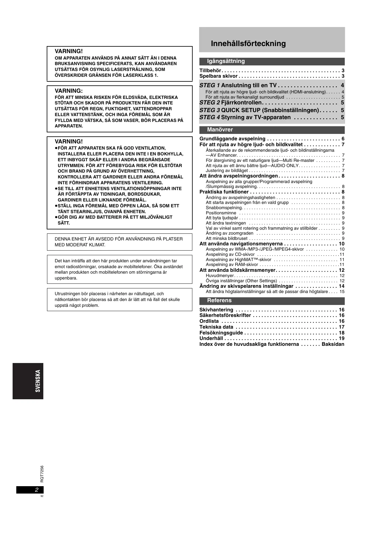 Skivhantering ∫ Rengöring av skivor DVD-Audio, DVD-Video, Video CD, SVCD och CD Torka dem med en fuktig tygduk, och torka sedan torrt. DVD-RAM och DVD-R ≥Gör rent skivorna med den separat tillgängliga skivrengöraren DVD-RAM/PD (LF-K200DCA1, där den finns tillgänglig). ≥Använd aldrig rengöringsdukar och rengöringsmedel för CD-skivor osv. ∫ Att iaktta vid hanteringen av skivor ≥Sätt inte på några etiketter eller klisterlappar på skivorna (det kan orsaka att skivorna böjs och blir oanvändbara). ≥Skriv inte på etikettsidan med en kulspetspenna eller något annat skrivdon. ≥Använd inte skivrengöringssprejer, benzen, thinner, anti-statvätskor, eller några andra lösningsmedel. ≥Använd inte skrapskydd eller andra skydd. ≥Använd inte följande slags skivor: – Skivor med synligt klister från borttagna klisterlappar och etiketter (hyrskivor o.d.). – Skivor som är kraftigt böjda eller har sprickor. – Oregelbundet formade skivor, som till exempel hjärtformade skivor. Säkerhetsföreskrifter Placering Främmande föremål Placera enheten på en jämn yta som inte utsätts för direkt solljus, höga temperaturer, hög luftfuktighet eller kraftiga vibrationer. Dessa omständigheter kan skada höljet och andra komponenter, och därmed förkorta enhetens bruksliv. Placera inga tunga föremål på enheten. Spänningskrav Använd inte strömkällor med högspänning. Det kan leda till överbelastning av enheten och orsaka en eldsvåda. Använd inte likspänningskällor. Kontrollera noggrant spänningskällan om enheten används på ett fartyg eller någon annan plats där likspänning används. Skydd av nätsladden Kontrollera att nätsladden är korrekt ansluten och inte har några skador. Dålig anslutning och skador på ledningstråden kan orsaka eldsvådor och elektriska stötar. Dra inte i sladden, böj den inte och placera inga tunga föremål på den. Fatta ett ordentligt tag om kontakten när sladden ska dras ur. Om du drar i själva sladden kan det orsaka en elektrisk stöt. Hantera inte kontakten med våta händer. Det kan orsaka en elektrisk stöt. Låt inga metallföremål komma in i enheten. Det kan orsaka elektriska stötar och funktionsstörningar. Låt det inte komma in vätskor i enheten. Det kan orsaka elektriska stötar och funktionsstörningar. Dra genast ut nätkontakten ur vägguttaget om detta skulle inträffa, och kontakta din återförsäljare. Spreja inte insektsmedel på eller i enheten. De innehåller lättantändliga gaser som kan antändas om de kommer in i enheten. Service Försök inte reparera enheten på egen hand. Dra ut nätkontakten ur vägguttaget om ljudet avbryts, indikatorerna inte tänds, rök avges eller något annat problem som inte tas upp i den här bruksanvisningen skulle uppstå, och kontakta din återförsäljare eller ett auktoriserat servicecenter. Om enheten repareras, tas isär eller byggs om av en okvalificerad person kan det leda till elektriska stötar eller skador på enheten. Koppla bort enheten från strömkällan om den inte ska användas under en längre tidsperiod, för att därigenom förlänga dess bruksliv. Ordlista CPPM (Content Protection for Prerecorded Media) Ett kopieringsskyddsystem som används för DVD-ljudfiler. Enheten stödjer CPPM. HDCD (High-Definition Compatible Digital) HDCD-kodade CD-skivor låter bättre eftersom de är kodade med 20 bitar, istället för de 16 bitar som används för alla andra CD-skivor. HDMI (High-Definition Multimedia Interface) HDMI är ett nästa-generations gränssnitt för elektroniska konsumentprodukter. Till skillnad från vanliga anslutningar, överför denna anslutning okomprimerade digitala bild- och ljudsignaler med en enda kabel. Den här enheten stödjer utmatning av högdefinitions videosignaler (750p, 1125i) från HDMI AV OUT-uttaget. För att njuta av högdefinitions video krävs det en kompatibel högdefinitions TV. MPEG4 Ett komprimeringssystem som kan användas på flyttbara enheter eller ett nätverk, och som ger effektiva inspelningar med låga överföringsvärden (bitvärden). Nermixning Detta är en process för att mixa ner flerkanaligt ljud (surroundljud) på vissa skivor till två kanaler. När du vill lyssna på ljudet på en DVD-skiva med ett 5.1-kanaligt digitalt surroundljudspår via TV-apparatens högtalare kommer det nermixade ljudet att matas ut. Vissa DVD-ljudskivor tillåter inte nermixning av delar av eller hela innehållet. Vid avspelning av hela eller delar av dessa skivor kommer ljudet inte att matas ut på rätt sätt om antalet anslutna högtalare inte är detsamma som de kanalangivelser som medföljer skivan. Samplingsfrekvens “Sampling” är den process, i vilken det tas prover av ljudvågornas amplitud (analoga signaler) vid jämna intervall, och dessa provvärden konverteras till siffror (digital kodning). Samplingsfrekvensen anger antalet provvärden som tas per sekund, och ett högre värde innebär därmed en mer trogen återgivning av det ursprungliga ljudet. RQT7256 Lista över språkkoder