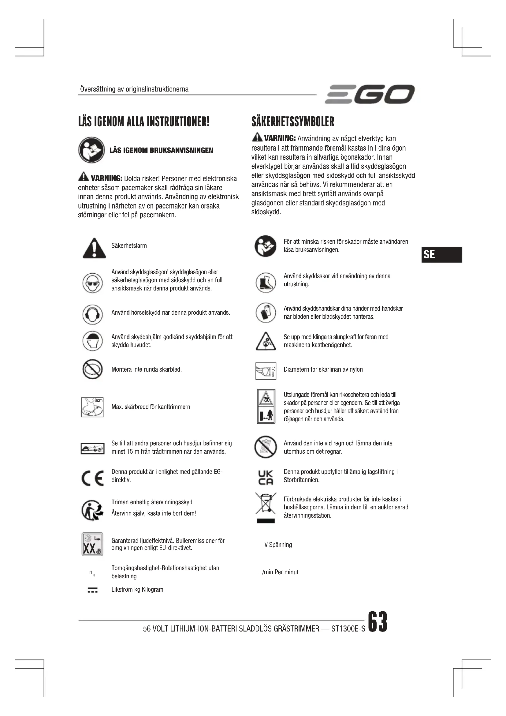 ◾ Ta ut batteripacket ur grästrimmern när maskinen inte används.Rengör maskinen noggrant innan den ställs av. ◾ Förvara maskinen i ett torrt, väl ventilerat, låst eller högt beläget ställe, oåtkomligt för barn. Maskinen får inte förvaras på eller nära konstgödsel, bensin eller andra kemikalier. Miljöskydd Kasta inte elektrisk utrustning, använt batteri och laddare i hushållssoporna! Ta denna produkt till en auktoriserad återvinnare och gör den tillgänglig för separat insamling. Elektriska verktyg måste returneras till en miljöanpassad återvinningsanläggning.56 VOLT LITHIUM-ION-BATTERI SLADDLÖS GRÄSTRIMMER — ST1300E-S68