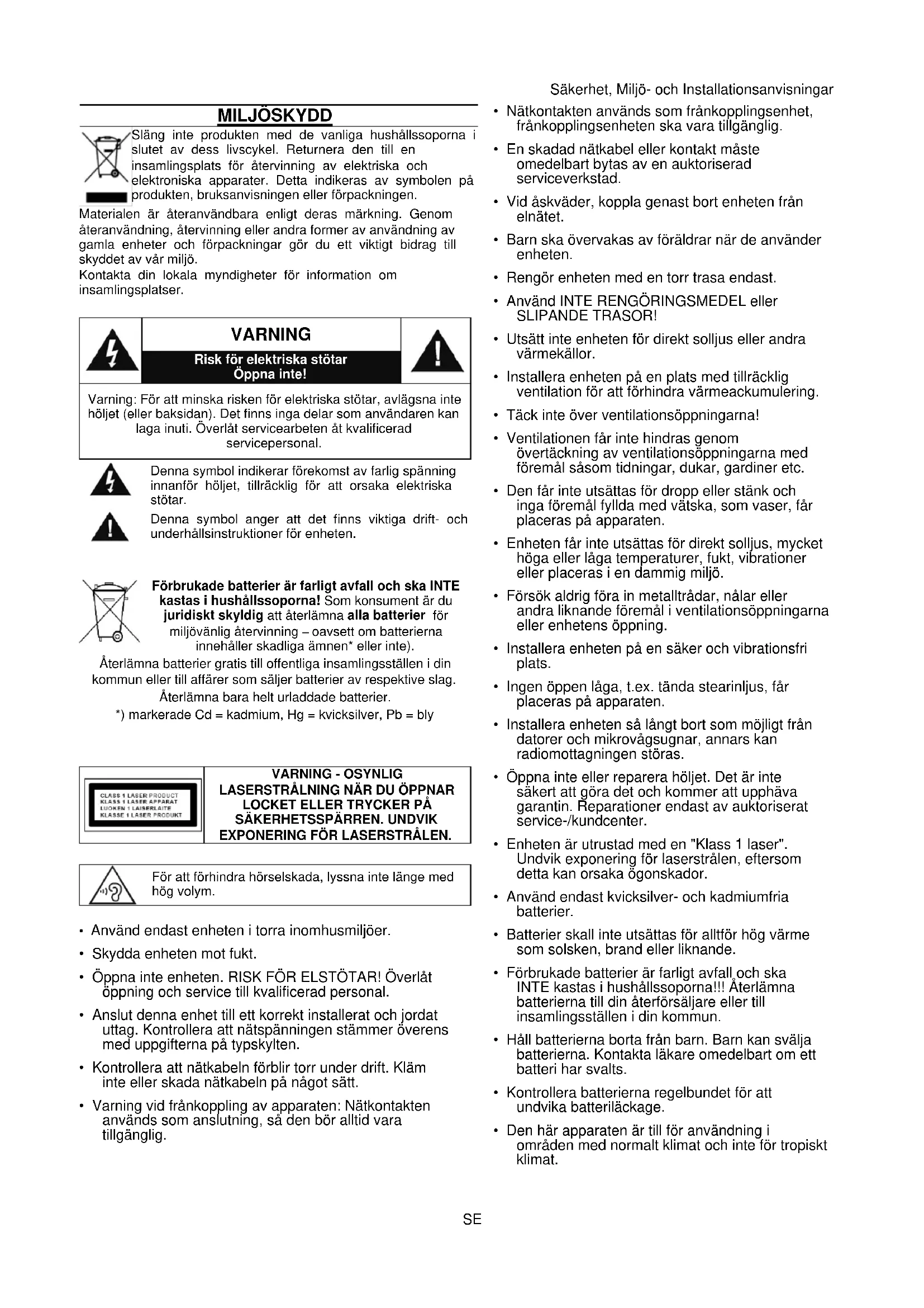 - Förbrukade batterier är farligt avfall och ska INTE kastas i hushållssoporna!!! Återlämna batterierna till din återförsäljare eller till insamlingsställen i din kommun.
