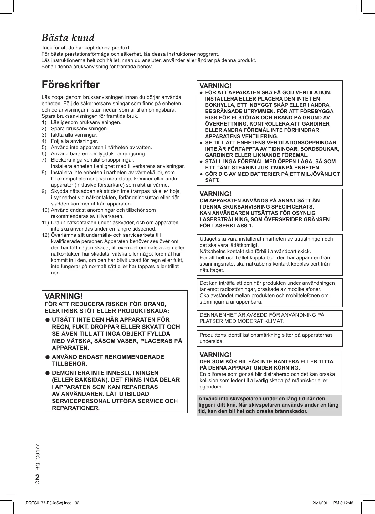 RQTC0177-D(It).indd 91 26/1/2011 PM 12:46:15 Bästa kund Tack för att du har köpt denna produkt. För bästa prestationsförmåga och säkerhet, läs dessa instruktioner noggrant. Läs instruktionerna helt och hållet innan du ansluter, använder eller ändrar på denna produkt. Behåll denna bruksanvisning för framtida behov. Föreskrifter Läs noga igenom bruksanvisningen innan du börjar använda enheten. Följ de säkerhetsanvisningar som finns på enheten, och de anvisningar i listan nedan som ar tillämpningsbara. Spara bruksanvisningen för framtida bruk.