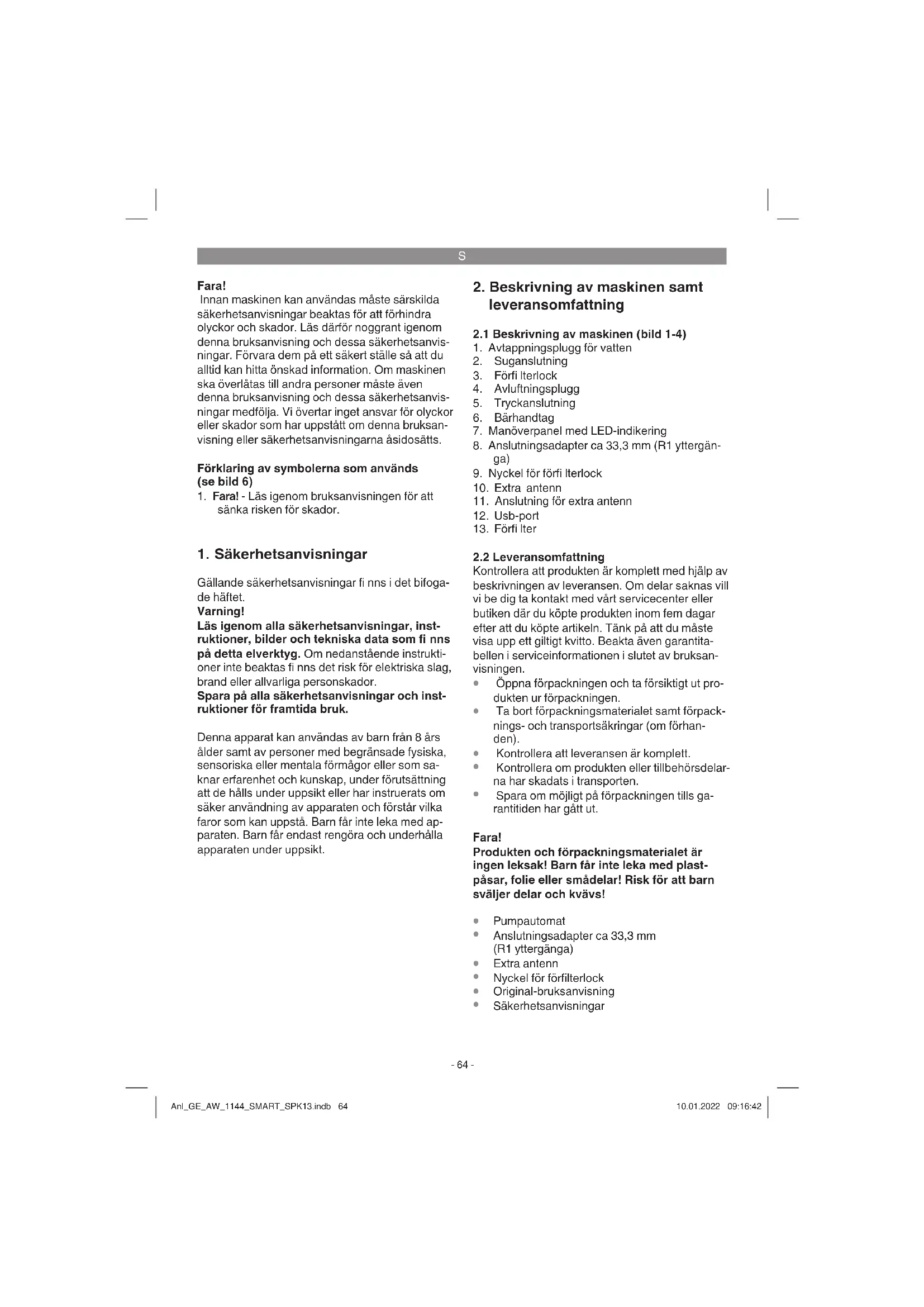 Undvik att suga in främmande föremål (t ex sand). Installera ett förfilter vid behov. Anl_GE_AW_1144_SMART_SPK13.indb 65Anl_GE_AW_1144_SMART_SPK13.indb 65 10.01.2022 09:16:4210.01.2022 09:16:42S