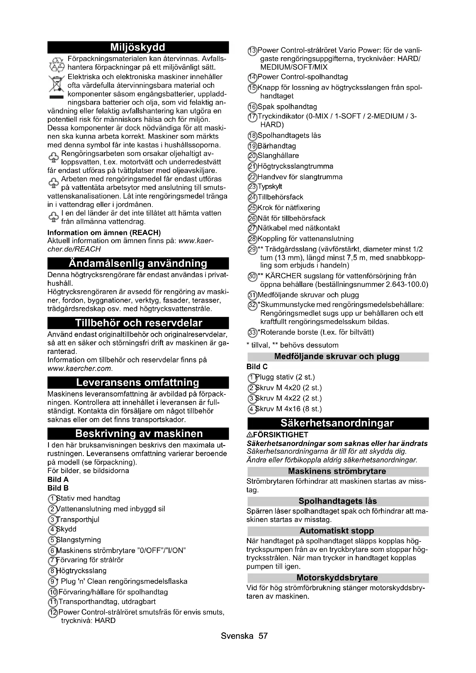 - EU-försäkran om överensstämmelse Svenska 57 Miljöskydd Förpackningsmaterialen kan återvinnas. Avfalls- hantera förpackningar på ett miljövänligt sätt. Elektriska och elektroniska maskiner innehåller ofta värdefulla återvinningsbara material och komponenter såsom engångsbatterier, uppladd- ningsbara batterier och olja, som vid felaktig an- vändning eller felaktig avfallshantering kan utgöra en potentiell risk för människors hälsa och för miljön. Dessa komponenter är dock nödvändiga för att maski- nen ska kunna arbeta korrekt. Maskiner som märkts med denna symbol får inte kastas i hushållssoporna. Rengöringsarbeten som orsakar oljehaltigt av- loppsvatten, t.ex. motortvätt och underredestvätt får endast utföras på tvättplatser med oljeavskiljare. Arbeten med rengöringsmedel får endast utföras på vattentäta arbetsytor med anslutning till smuts- vattenskanalisationen. Låt inte rengöringsmedel tränga in i vattendrag eller i jordmånen. I en del länder är det inte tillåtet att hämta vatten från allmänna vattendrag. Information om ämnen (REACH) Aktuell information om ämnen finns på: www.kaer- cher.de/REACH Ändamålsenlig användning Denna högtrycksrengörare får endast användas i privat- hushåll. Högtrycksrengöraren är avsedd för rengöring av maski- ner, fordon, byggnationer, verktyg, fasader, terasser, trädgårdsredskap osv. med högtrycksvattenstråle. Tillbehör och reservdelar Använd endast originaltillbehör och originalreservdelar, så att en säker och störningsfri drift av maskinen är ga- ranterad. Information om tillbehör och reservdelar finns på www.kaercher.com. Leveransens omfattning Maskinens leveransomfattning är avbildad på förpack- ningen. Kontrollera att innehållet i leveransen är full- ständigt. Kontakta din försäljare om något tillbehör saknas eller om det finns transportskador. Beskrivning av maskinen I den här bruksanvisningen beskrivs den maximala ut- rustningen. Leveransens omfattning varierar beroende på modell (se förpackning). För bilder, se bildsidorna Bild A Bild B 1 Stativ med handtag 2 Vattenanslutning med inbyggd sil 3 Transporthjul 4 Skydd 5 Slangstyrning 6 Maskinens strömbrytare ”0/OFF”/”I/ON” 7 Förvaring för strålrör 8 Högtrycksslang 9 * Plug 'n' Clean rengöringsmedelsflaska 10 Förvaring/hållare för spolhandtag 11 Transporthandtag, utdragbart 12 Power Control-strålröret smutsfräs för envis smuts, trycknivå: HARD 13 Power Control-strålröret Vario Power: för de vanli- gaste rengöringsuppgifterna, trycknivåer: HARD/ p. 61