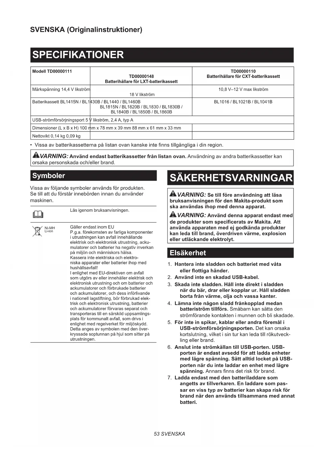 - Vissa av batterikassetterna på listan ovan kanske inte nns tillgängliga i din region. VARNING: Använd endast batterikassetter från listan ovan. Användning av andra batterikassetter kan orsaka personskada och/eller brand. Symboler Vissa av följande symboler används för produkten. Se till att du förstår innebörden innan du använder maskinen. Läs igenom bruksanvisningen. Ni-MH Li-ion Gäller endast inom EU P.g.a. förekomsten av farliga komponenter i utrustningen kan avfall innehållande elektrisk och elektronisk utrustning, acku- mulatorer och batterier ha negativ inverkan på miljön och människors hälsa. Kassera inte elektriska och elektro- niska apparater eller batterier ihop med hushållsavfall! I enlighet med EU-direktiven om avfall som utgörs av eller innehåller elektrisk och elektronisk utrustning och om batterier och ackumulatorer och förbrukade batterier och ackumulatorer, och dess införlivande i nationell lagstiftning, bör förbrukad elek- trisk och elektronisk utrustning, batterier och ackumulatorer förvaras separat och transporteras till en särskild uppsamlings- plats för kommunalt avfall, som drivs i enlighet med regelverket för miljöskydd. Detta anges av symbolen med den över- kryssade soptunnan på hjul som sitter på utrustningen. SÄKERHETSVARNINGAR VARNING: Se till före användning att läsa bruksanvisningen för den Makita-produkt som ska användas ihop med denna apparat. VARNING: Använd denna apparat endast med de produkter som specicerats av Makita. Att använda apparaten med ej godkända produkter kan leda till brand, överdriven värme, explosion eller utläckande elektrolyt. Elsäkerhet