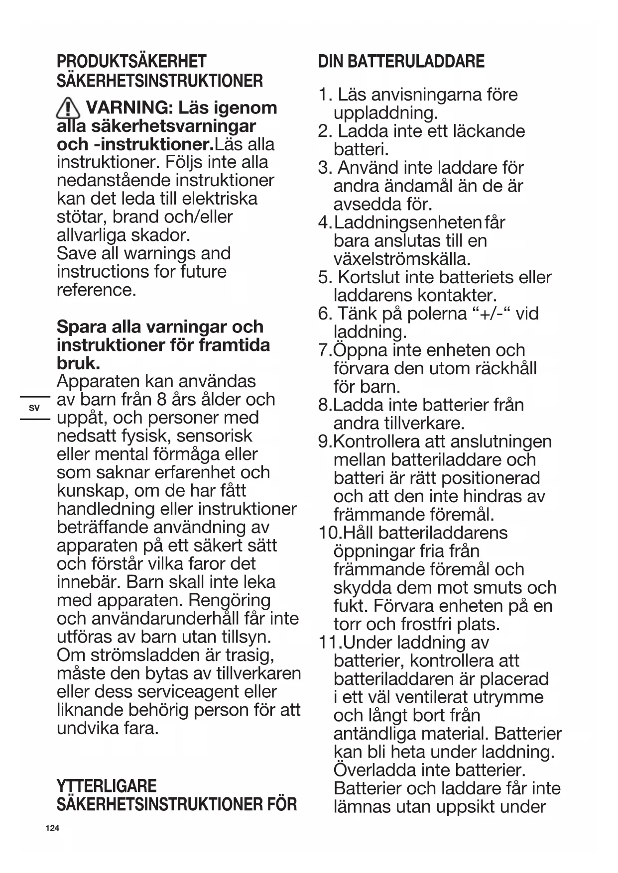 PRODUKTSÄKERHET SÄKERHETSINSTRUKTIONER VARNING: Läs igenom alla säkerhetsvarningar och -instruktioner.Läs alla instruktioner. Följs inte alla nedanstående instruktioner kan det leda till elektriska stötar, brand och/eller allvarliga skador. Save all warnings and instructions for future reference. Spara alla varningar och instruktioner för framtida bruk. Apparaten kan användas av barn från 8 års ålder och uppåt, och personer med nedsatt fysisk, sensorisk eller mental förmåga eller som saknar erfarenhet och kunskap, om de har fått handledning eller instruktioner beträffande användning av apparaten på ett säkert sätt och förstår vilka faror det innebär. Barn skall inte leka med apparaten. Rengöring och användarunderhåll får inte utföras av barn utan tillsyn. Om strömsladden är trasig, måste den bytas av tillverkaren eller dess serviceagent eller liknande behörig person för att undvika fara. YTTERLIGARE