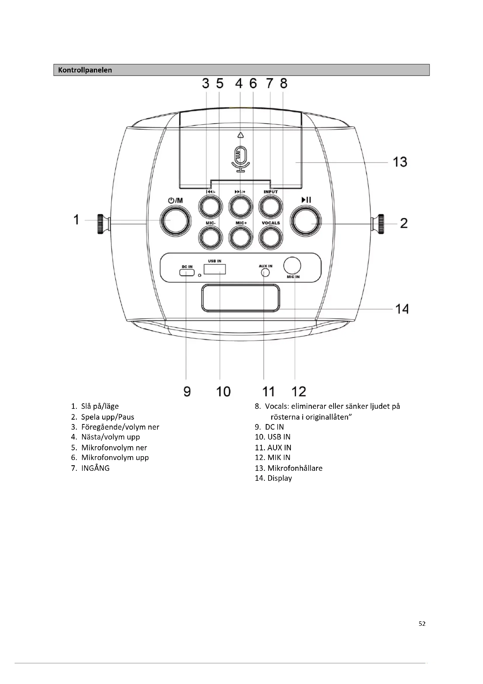 7. Knappfunktioner: M/Ström på/Nästa/PRE/MIK+-/RÖST/INGÅNG/SPELA UPP ELLER PAUSA