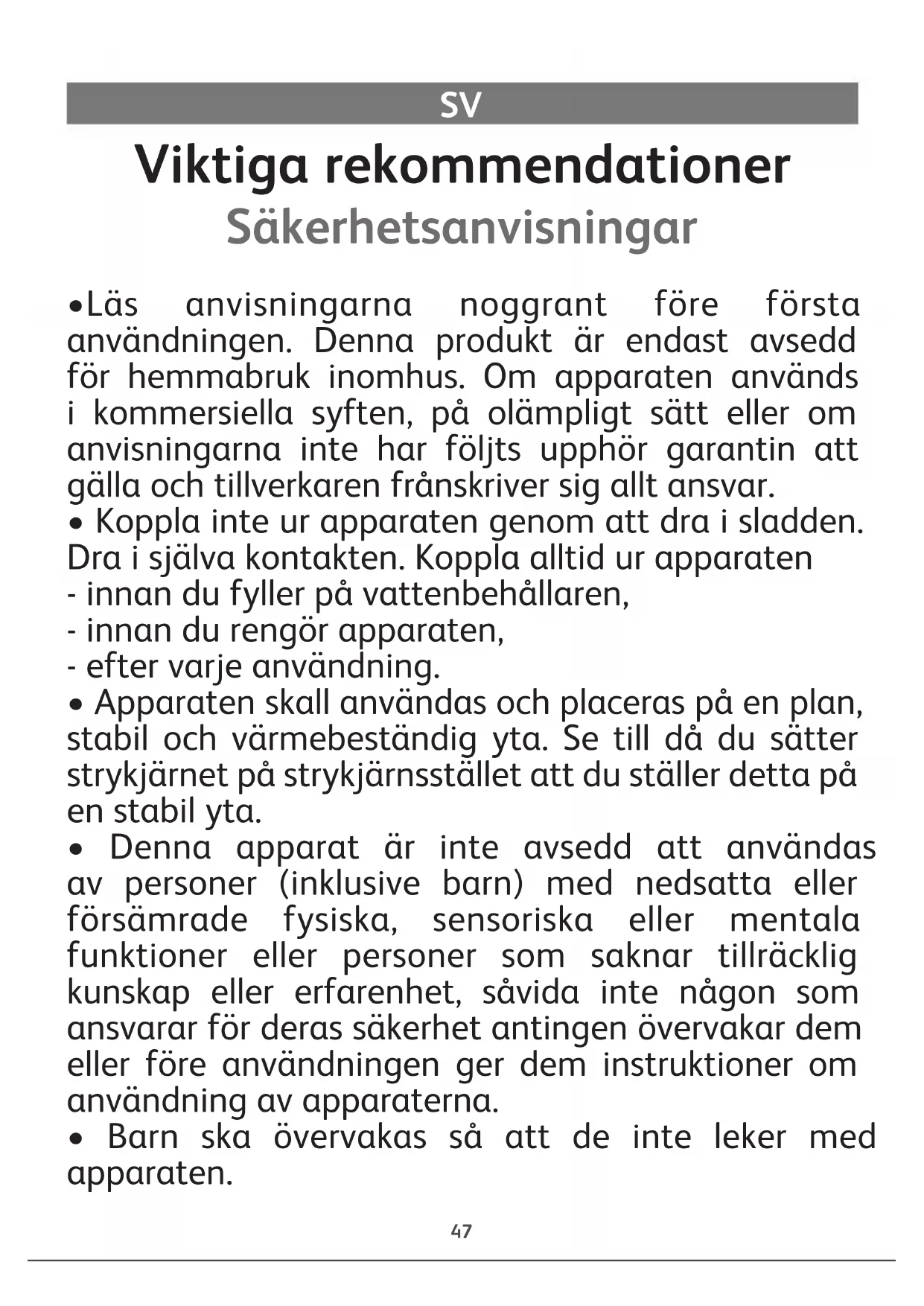 - Denna apparat kan användas av barn från 8 år och uppåt och av personer utan tillräcklig kunskap eller erfarenhet eller av personer med nedsatta fysiska, sensoriska eller mentala funktioner, förutsatt att de har fått noggranna instruktioner avseende användningen av apparaten, övervakas och förstår de härmed sammanhängande riskerna. Barn ska inte leka med apparaten. Rengöring och underhåll får inte utföras av barn utan tillsyn. Håll strykjärnet och dess sladd utom räckhåll för barn som är yngre än 8 år när det används eller håller på att svalna.