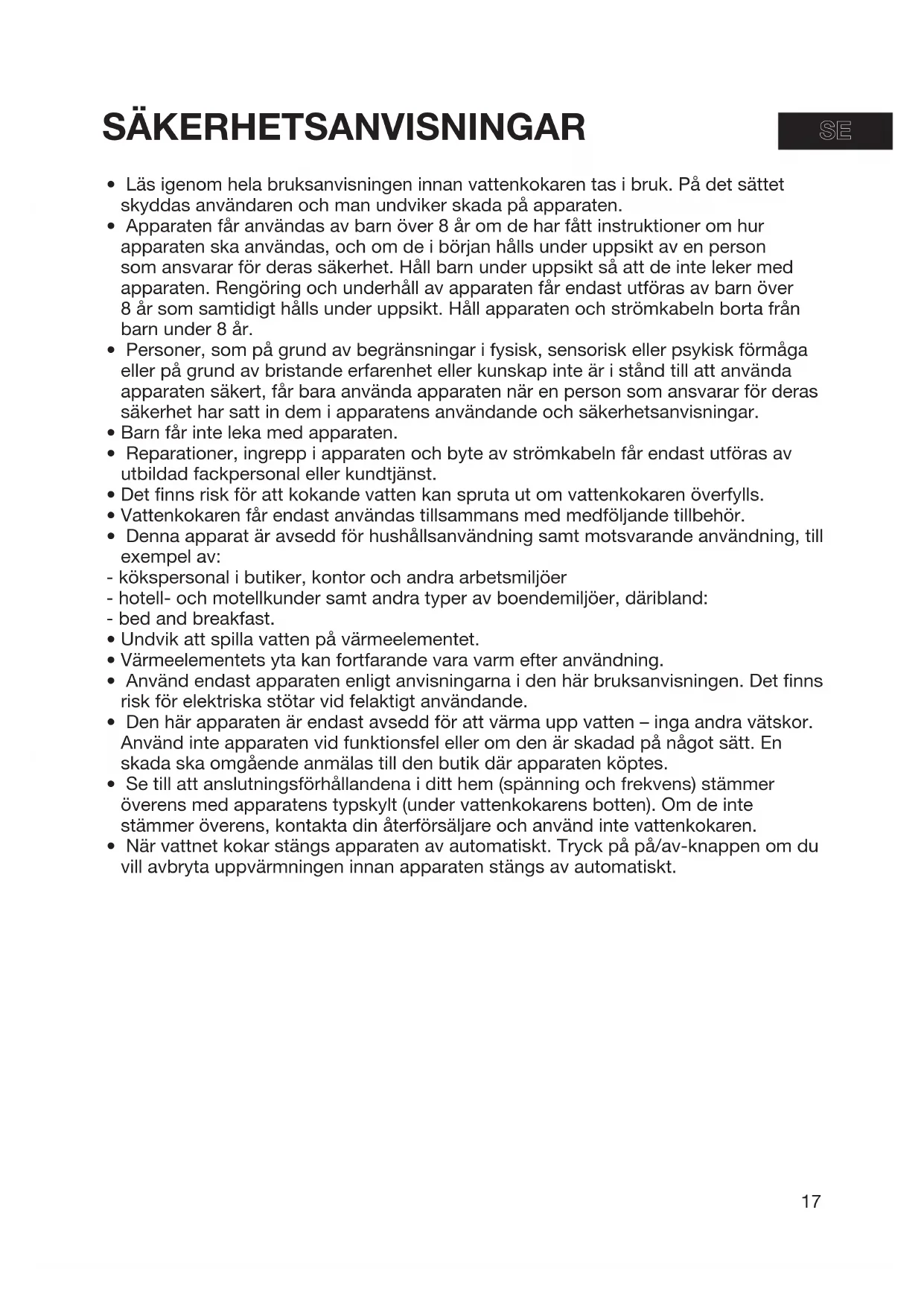 - När vattnet kokar stängs apparaten av automatiskt. Tryck på på/av-knappen om du vill avbryta uppvärmningen innan apparaten stängs av automatiskt. SÄKERHETSANVISNINGAR SESE18