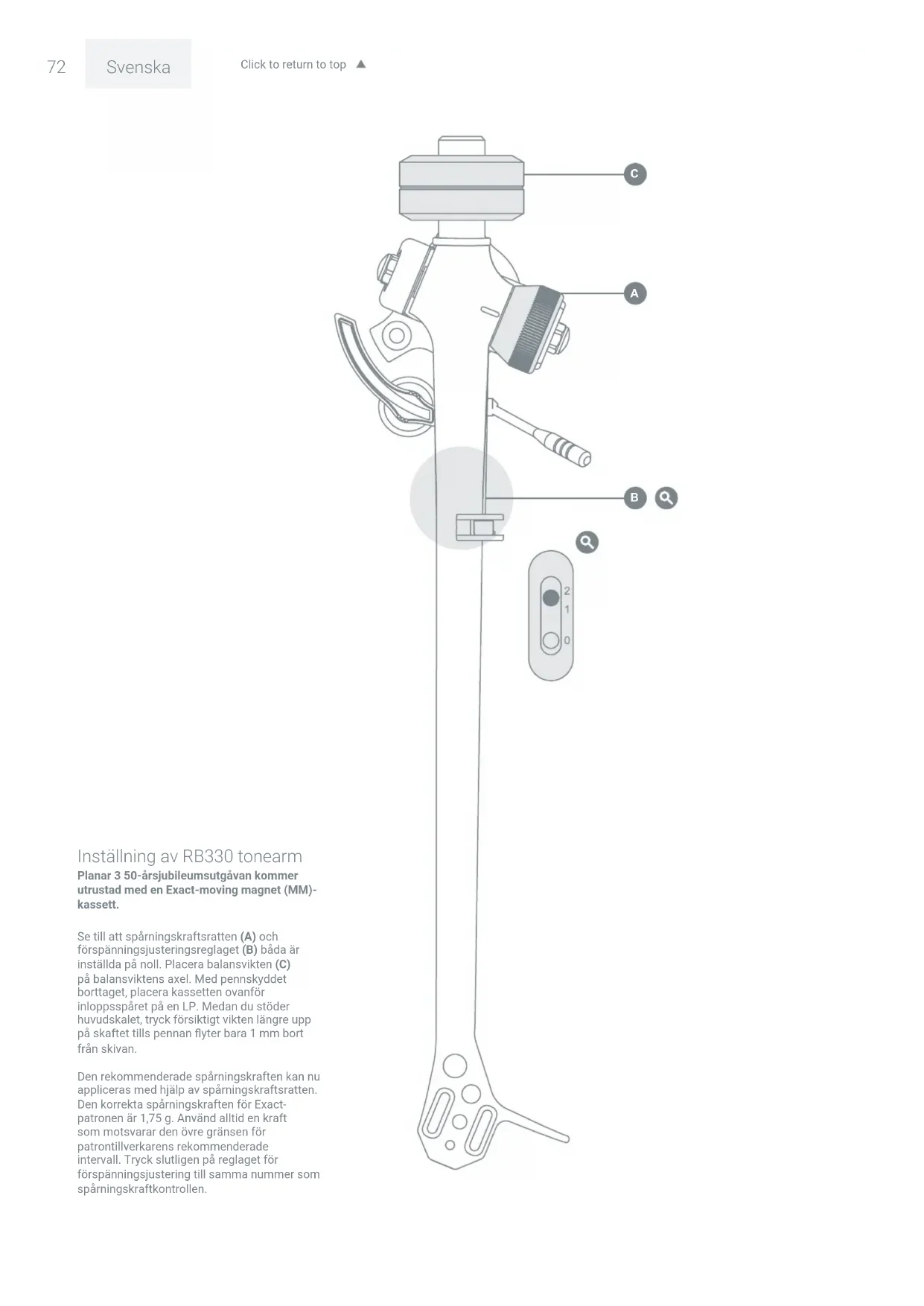 Inställning av RB330 tonearm Planar350-årsjubileumsutgåvan kommer utrustad med en Exact-moving magnet (MM)- kassett. Se till att spårningskraftsratten (A) och förspänningsjusteringsreglaget (B) båda är inställda på noll. Placera balansvikten (C) på balansviktens axel. Med pennskyddet borttaget, placera kassetten ovanför inloppsspåret på en LP. Medan du stöder huvudskalet, tryck försiktigt vikten längre upp på skaftet tills pennan yter bara 1 mm bort från skivan. Den rekommenderade spårningskraften kan nu appliceras med hjälp av spårningskraftsratten. Den korrekta spårningskraften för Exact- patronen är 1,75 g. Använd alltid en kraft som motsvarar den övre gränsen för patrontillverkarens rekommenderade intervall. Tryck slutligen på reglaget för förspänningsjustering till samma nummer som spårningskraftkontrollen. Svenska Click to return to top73 Hastighetsjustering (fabriksinställd – justeras endast vid behov) Observera: Hastigheten är fabriksinställd. Vi rekommenderar inte att du justerar den om det inte är i samband med service eller byte av drivremmen.