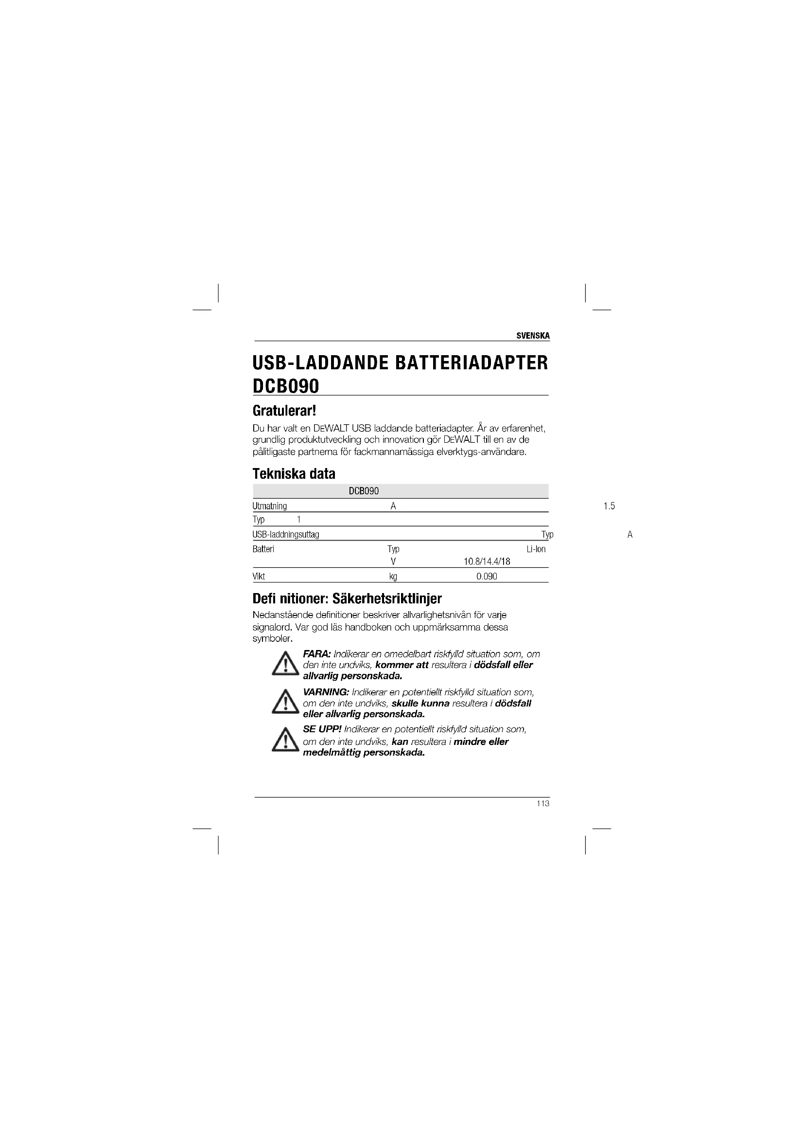 USB-LADDANDE BATTERIADAPTER DCB090 Gratulerar! Du har valt en DEWALT USB laddande batteriadapter. År av erfarenhet, grundlig produktutveckling och innovation gör D EWALT till en av de pålitligaste partnerna för fackmannamässiga elverktygs-användare. Tekniska data DCB090 Utmatning A 1.5 Typ 1 USB-laddningsuttag Typ A Batteri Typ Li-Ion V 10.8/14.4/18 Vikt kg 0.090 Defi nitioner: Säkerhetsriktlinjer Nedanstående definitioner beskriver allvarlighetsnivån för varje signalord. Var god läs handboken och uppmärksamma dessa symboler. FARA: Indikerar en omedelbart riskfylld situation som, om den inte undviks, kommer att resultera i dödsfall eller allvarlig personskada. VARNING: Indikerar en potentiellt riskfylld situation som, om den inte undviks, skulle kunna resultera i dödsfall eller allvarlig personskada. SE UPP! Indikerar en potentiellt riskfylld situation som, om den inte undviks, kan resultera i mindre eller medelmåttig personskada.SVENSKA