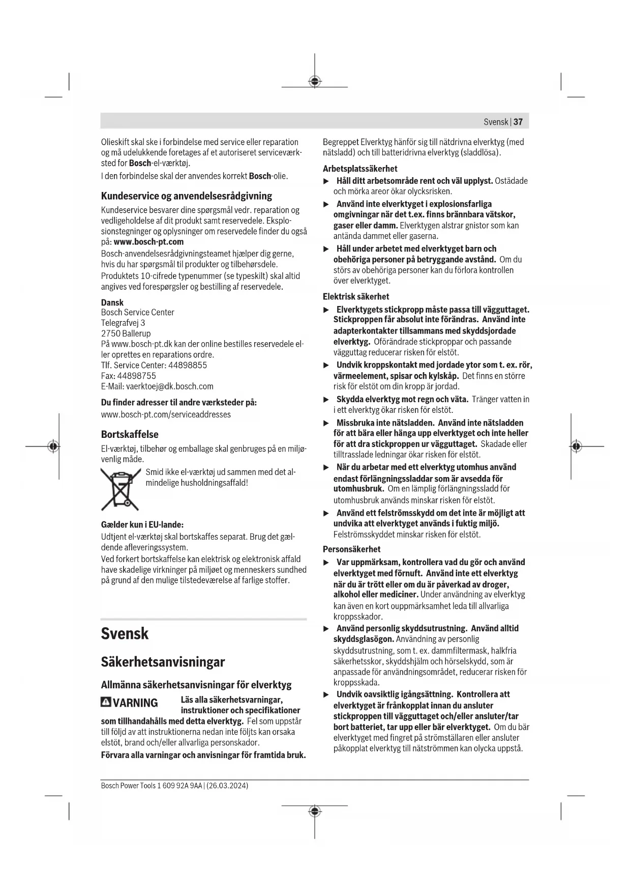 Det svingningsniveau og støjemissionsniveau, der fremgår af anvisningerne, er målt iht. en standardiseret måleværdi og kan anvendes til sammenligning af elværktøj med hinanden. De er også egnet til en foreløbig vurdering af svingnings- og støjemissionen. Det angivne svingnings- og støjemissionsniveau repræsente- rer de væsentlige anvendelser af el‑værktøjet. Hvis el‑værk- tøjet dog anvendes til andre formål, med afvigende indsats- værktøj eller utilstrækkelig vedligeholdelse, kan svingnings- og støjemissionsniveauet afvige. Dette kan føre til en betyde- lig forøgelse af svingnings- og støjemissionen i hele arbejds- tidsrummet. Bosch Power Tools 1 609 92A 9AA | (26.03.2024)36 | Dansk Til en nøjagtig vurdering af svingnings- og støjemissionen bør der også tages højde for de tider, i hvilke værktøjet er sluk- ket eller godt nok kører, men rent faktisk ikke anvendes. Det- te kan føre til en betydelig reduktion af svingnings- og støje- missionsniveauet i hele arbejdstidsrummet. Fastlæg ekstra sikkerhedsforanstaltninger til beskyttelse af brugeren mod svingningers virkning som f.eks.: Vedligehol- delse af el‑værktøj og indsatsværktøj, holde hænder varme, organisation af arbejdsforløb. Montering u Træk stikket ud af stikkontakten, før der udføres ar- bejde på el‑værktøjet. Ekstrahåndtag u Brug kun el-værktøjet med ekstrahåndtaget (6). Du kan dreje ekstrahåndtaget (6) efter behov for at opnå en sikker og mindre trættende arbejdsstilling. – Drej det nederste grebsstykke på ekstrahåndtaget (6) mod uret, og sving ekstrahåndtaget (6) til den ønskede position. Drej derefter det nederste grebsstykke på ek- strahåndtaget (6) med uret, så det skrues fast igen. Værktøjsskift Værktøjsholderen SDS plus bruges til at skifte indsatsværk- tøj nemt og hurtigt uden brug af ekstra værktøj. Støvbeskyttelseskappen (1) forhindrer i stort omfang, at støv trænger ind i værktøjsholderen under brug. Når værktø- jet sættes i, skal du sørge for, at støvbeskyttelseskappen(1) ikke beskadiges. u En beskadiget støvbeskyttelseskappe skal straks ud- skiftes. Det anbefales at lade en kundeservice udføre arbejdet. Isætning af indsatsværktøj (sebilledeA) – Rengør indsatsværktøjets indstiksende, og smør den med en smule fedt. – Isæt indsatsværktøjet i værktøjsholderen med en dreje- bevægelse, til det automatisk låses. – Kontrollér, at værktøjet sidder rigtigt fast ved at trække i det. Udtagning af indsatsværktøj (se billede B) – Skub låsekappen (2) tilbage, og tag indsatsværktøjet ud. Støv-/spånudsugning Støv fra materialer som f.eks. blyholdig maling, nogle træ- sorter, mineraler og metal kan være sundhedsfarlige. Berø- ring eller indånding af støv kan føre til allergiske reaktioner og/eller åndedrætssygdomme hos brugeren eller personer, der opholder sig i nærheden af arbejdspladsen. Bestemt støv som f.eks. ege- eller bøgestøv gælder som kræftfremkaldende, især i forbindelse med ekstra stoffer til træbehandling (chromat, træbeskyttelsesmiddel). Asbest- holdigt materiale må kun bearbejdes af fagfolk. – Sørg for god udluftning af arbejdspladsen. – Det anbefales at bære åndeværn med filterklasse P2. Overhold forskrifterne, der gælder i dit land vedr. de materi- aler, der skal bearbejdes. Brug Ibrugtagning u Kontroller netspændingen! Strømkildens spænding skal stemme overens med angivelserne på el-værktøjets type- skilt. Tænd/sluk – Ved ibrugtagning af el‑værktøjet skal du trykke på tænd/ sluk-knappen (5) og holde den inde. – Du låser den indtrykkede tænd/sluk-knap (5) ved at tryk- ke på kontaktspærren (4). – For at slukke el-værktøjet skal du slippe tænd/sluk-knap- pen (5) eller, hvis den er låst med kontaktspærren (4), trykke kort på tænd/sluk-knappen (5) og slippe den igen. Ved lave temperaturer når el-værktøjet først efter et vist stykke tid den fulde slagkapacitet. Denne starttid kan afkor- tes ved at støde indsatsværktøjet i el-værktøjet mod jorden. Indstilling af slagtal Du kan regulere slagtallet på det tændte el-værktøj trinløst, afhængigt af hvor langt du trykker tænd/sluk-knappen(5) ind. Et let tryk på tænd/sluk-knappen(5) medfører et lavt slagtal. Med tiltagende tryk øges slagtallet. Ændring af mejselstilling (Vario Lock) Du kan låse mejslen i 12 stillinger. Derved kan du hver gang indtage den optimale arbejdsstilling. – Indsæt mejslen i værktøjsholderen. – Skub mejselindstillingsringen (3) frem, og drej mejslen til den ønskede stilling med mejselindstillingsringen (3). – Slip mejselindstillingsringen (3) igen, og drej mejslen, indtil den går i indgreb. Vedligeholdelse og service Vedligeholdelse og rengøring u Træk stikket ud af stikkontakten, før der udføres ar- bejde på el‑værktøjet. u El‑værktøj og el‑værktøjets ventilationsåbninger skal altid holdes rene for at sikre et godt og sikkert ar- bejde. Hvis det er nødvendigt at erstatte tilslutningsledningen, skal dette arbejde udføres af Bosch eller på et autoriseret servi- ceværksted for Bosch el‑værktøj for at undgå farer. u En beskadiget støvbeskyttelseskappe skal straks ud- skiftes. Det anbefales at lade en kundeservice udføre arbejdet. Smøring af el-værktøj El-værktøjet er oliesmurt. 1 609 92A 9AA | (26.03.2024) Bosch Power ToolsSvensk | 37 Olieskift skal ske i forbindelse med service eller reparation og må udelukkende foretages af et autoriseret serviceværk- sted for Bosch-el-værktøj. I den forbindelse skal der anvendes korrekt Bosch-olie. Kundeservice og anvendelsesrådgivning Kundeservice besvarer dine spørgsmål vedr. reparation og vedligeholdelse af dit produkt samt reservedele. Eksplo- sionstegninger og oplysninger om reservedele finder du også på: www.bosch-pt.com Bosch-anvendelsesrådgivningsteamet hjælper dig gerne, hvis du har spørgsmål til produkter og tilbehørsdele. Produktets 10‑cifrede typenumme