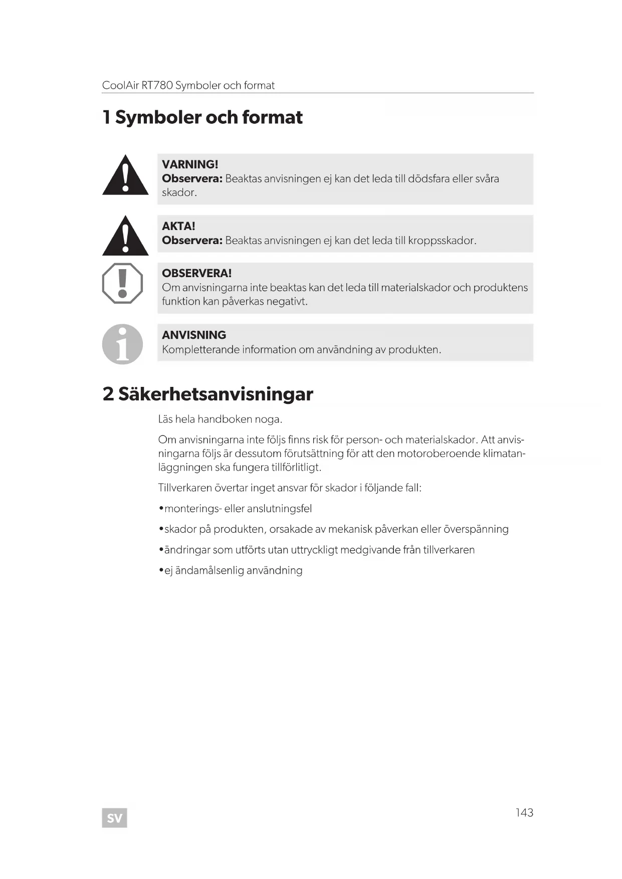 - ej ändamålsenlig användning VARNING! Observera: Beaktas anvisningen ej kan det leda till dödsfara eller svåra skador. AKTA! Observera: Beaktas anvisningen ej kan det leda till kroppsskador. OBSERVERA! Om anvisningarna inte beaktas kan det leda till materialskador och produktens funktion kan påverkas negativt. ANVISNING Kompletterande information om användning av produkten. RT780-Iveco--I-16s.book Seite 143 Donnerstag, 6. Juli 2017 3:16 15SV Säkerhetsanvisningar CoolAir RT780