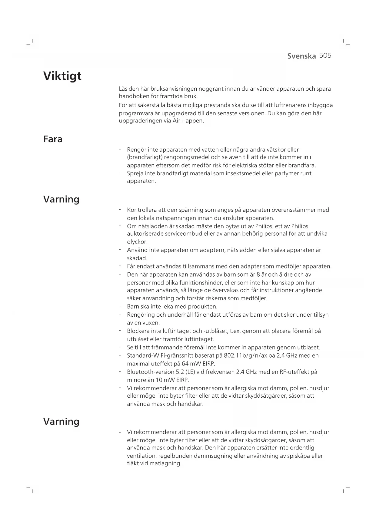 Bluetooth-version 5.2 (LE) vid frekvensen 2,4 GHz med en RF-uteffekt pa mindre an 10mW EIRP. - Vi rekommenderar att personer som ar allergiska mot damm, pollen, husdjur erler mogel inte byter filter erler att de vidtar skyddsåtgärder, sasom att använda mask och handskar.