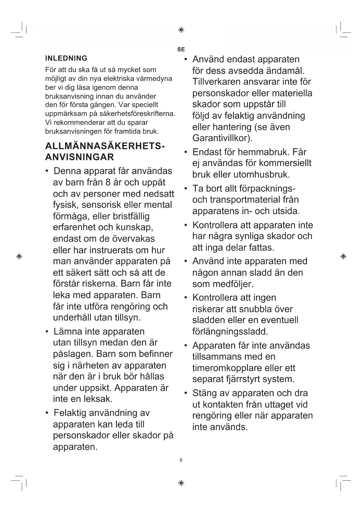 INLEDNING För att du ska få ut så mycket som möjligt av din nya elektriska värmedyna ber vi dig läsa igenom denna bruksanvisning innan du använder den för första gången. Var speciellt uppmärksam på säkerhetsföreskrifterna. Vi rekommenderar att du sparar bruksanvisningen för framtida bruk.