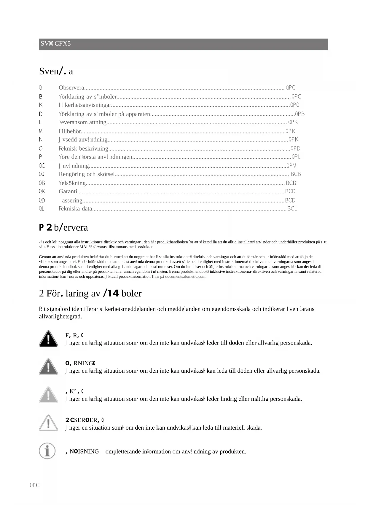 - 15 Tekniska data 1 Observera Läs och följ noggrant alla instruktioner, direktiv och varningar i den här produkthandboken för att säkerställa att du alltid installerar, använder och underhåller produkten på rätt sätt. Dessa instruktioner MÅSTE förvaras tillsammans med produkten. Genom att använda produkten bekräar du härmed att du noggrant har läst alla instruktioner, direktiv och varningar och att du förstår och är införstådd med att följa de villkor som anges häri. Du är införstådd med att endast använda denna produkt i avsett sye och i enlighet med instruktionerna, direktiven och varningarna som anges i denna produkthandbok samt i enlighet med alla gällande lagar och bestämmelser. Om du inte läser och följer instruktionerna och varningarna som anges här kan det leda till personskador på dig eller andra, på produkten eller annan egendom i närheten. Denna produkthandbok, inklusive instruktionerna, direktiven och varningarna samt relaterad information, kan ändras och uppdateras. Aktuell produktinformation finns på documents.dometic.com. 2 Förklaring av symboler Ett signalord identifierar säkerhetsmeddelanden och meddelanden om egendomsskada och indikerar även farans allvarlighetsgrad. FARA! Anger en farlig situation som, om den inte kan undvikas, leder till döden eller allvarlig personskada. VARNING! Anger en farlig situation som, om den inte kan undvikas, kan leda till döden eller allvarlig personskada. AKTA! Anger en farlig situation som, om den inte kan undvikas, leder lindrig eller måttlig personskada. OBSERVERA! Anger en situation som, om den inte kan undvikas, kan leda till materiell skada. ANVISNING Kompletterande information om användning av produkten. 190CFX5SV 3 Säkerhetsanvisningar FARA! Risk för dödsfall på grund av elektricitet För båtar: Om apparaten drivs med nätspänning, se till att strömförsörjningen är säkrad med en jordfelsbrytare (RCD), en automatsäkring för restström (RCCB) eller en jordfelsbrytare (GFCI). Installationen måste ske enligt gällande regler, särskilt i fuktiga utrymmen. Ta inte tag i avskalade ledningar med händerna. Detta gäller framför allt vid dri med växelström. Kontrollera, innan apparaten tas i dri, att elkabeln och stickkontakten är torra. VARNING! Explosionsrisk Lagra inga ämnen som kan explodera i kylapparaten, som t.ex. sprayburkar med lättantändlig drivgas. VARNING! Risk för dödsfall på grund av elektricitet Använd inte kylapparaten om den uppvisar synliga skador. Om kylapparatens anslutningskabel skadas måste den, av säkerhetsskäl, bytas ut mot en lämplig kabel eller kabelsats som finns tillgängliga hos tillverkaren eller servicerepresentanten. Denna kylapparat får endast repareras av härför utbildad personal. Om man utför reparationer på fel sätt kan man utsättas för avsevärda risker. Koppla in enheten i uttag med garanterat korrekt anslutning när enheten behöver jordas. VARNING! Brandrisk Kontrollera att elsladden inte har fastnat eller skadats i samband med placering av kylapparaten. Placera inte ut flera bärbara uttag eller bärbara nätaggregat bakom apparaten. Vid skador på kylkretsen: p. 205