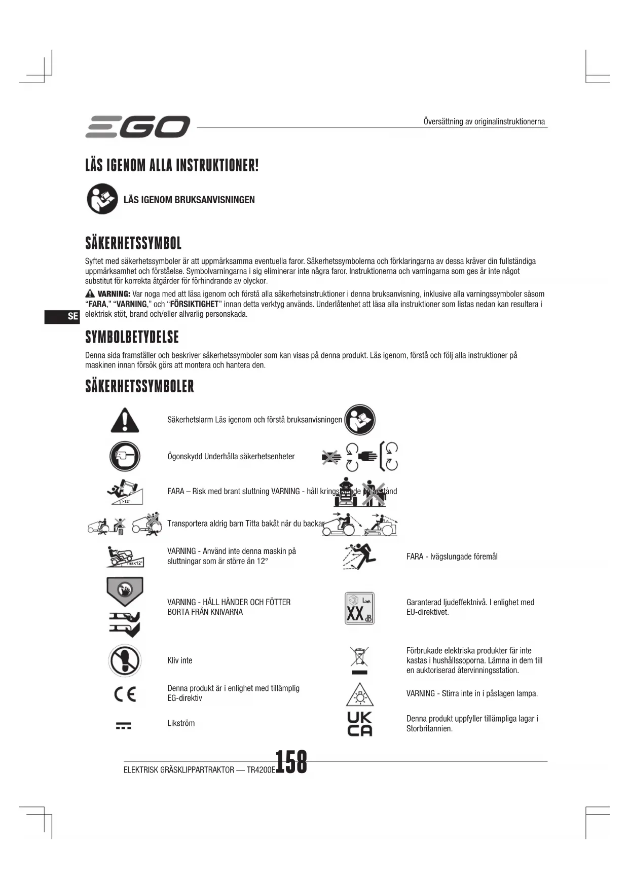 SÄKERHETSSYMBOL Syftet med säkerhetssymboler är att uppmärksamma eventuella faror. Säkerhetssymbolerna och förklaringarna av dessa kräver din fullständiga uppmärksamhet och förståelse. Symbolvarningarna i sig eliminerar inte några faror. Instruktionerna och varningarna som ges är inte något substitut för korrekta åtgärder för förhindrande av olyckor. VARNING: Var noga med att läsa igenom och förstå alla säkerhetsinstruktioner i denna bruksanvisning, inklusive alla varningssymboler såsom “FARA,” “VARNING,” och “FÖRSIKTIGHET” innan detta verktyg används. Underlåtenhet att läsa alla instruktioner som listas nedan kan resultera i elektrisk stöt, brand och/eller allvarlig personskada. SYMBOLBETYDELSE Denna sida framställer och beskriver säkerhetssymboler som kan visas på denna produkt. Läs igenom, förstå och följ alla instruktioner på maskinen innan försök görs att montera och hantera den. SÄKERHETSSYMBOLER Säkerhetslarm Läs igenom och förstå bruksanvisningenÖgonskydd Underhålla säkerhetsenheter>12°FARA – Risk med brant sluttning VARNING - håll kringstående på avståndTransportera aldrig barn Titta bakåt när du backarmax12°VARNING - Använd inte denna maskin på sluttningar som är större än 12°FARA - Ivägslungade föremålVARNING - HÅLL HÄNDER OCH FÖTTER BORTA FRÅN KNIVARNA Garanterad ljudeffektnivå. I enlighet med EU-direktivet.Kliv inteFörbrukade elektriska produkter får inte kastas i hushållssoporna. Lämna in dem till en auktoriserad återvinningsstation.Denna produkt är i enlighet med tillämplig EG-direktivVARNING - Stirra inte in i påslagen lampa.LikströmDenna produkt uppfyller tillämpliga lagar i Storbritannien.Översättning av originalinstruktionerna159ELEKTRISK GRÄSKLIPPARTRAKTOR — TR4200E