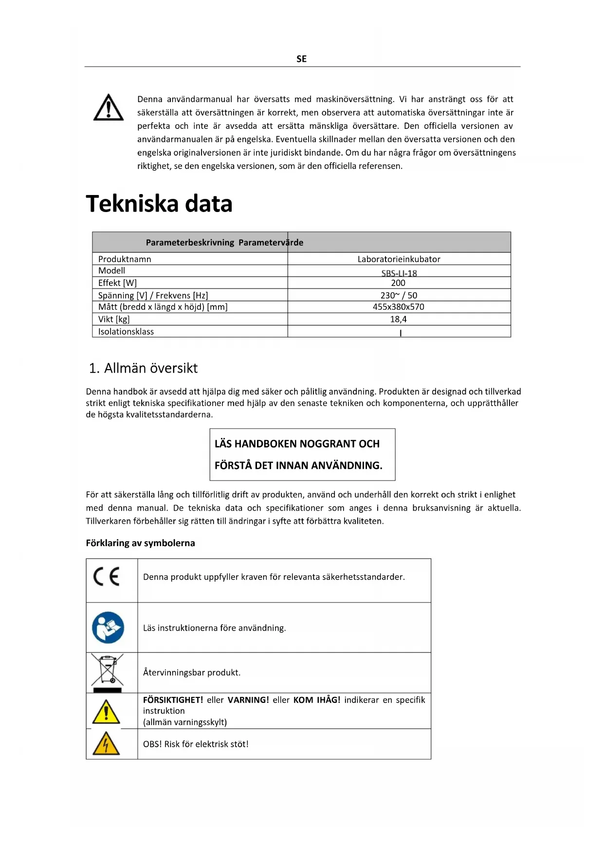 j) Försök aldrig manipulera apparaten för att ändra dess parametrar eller struktur. k) Håll apparaten borta från eld- och värmekällor. l) Täck inte till apparatens ventiler! m) Använd inte brandfarliga eller explosiva organiska lösningsmedel när du använder apparaten. n) Placera inga flyktiga ämnen inuti apparaten i drift. o) Utsätt inte apparaten med mekaniskt tryck och utsätt den inte för stötar eller fall. p) Förvara inga föremål ovanpå apparaten. q) Flytta inte apparaten med några prover inuti den. Om apparaten måste flyttas, koppla först bort den från strömförsörjningen och använd båda händerna för att flytta inkubatorn medan du håller den vågrätt. r) Om någon funktion misslyckas, stoppa omedelbart inkubationsprocessen. Felaktiga driftsförhållanden kan resultera i skadlig verkan av provinnehållet. OBS! Även om apparaten har utformats för att vara säker och har försetts med adekvata skyddsåtgärder, och trots användning av ytterligare säkerhetsåtgärder, finns det fortfarande en låg kvarstående risk för olyckor eller skador under driften. Var hela tiden uppmärksam och använd sunt förnuft när du använder apparaten.