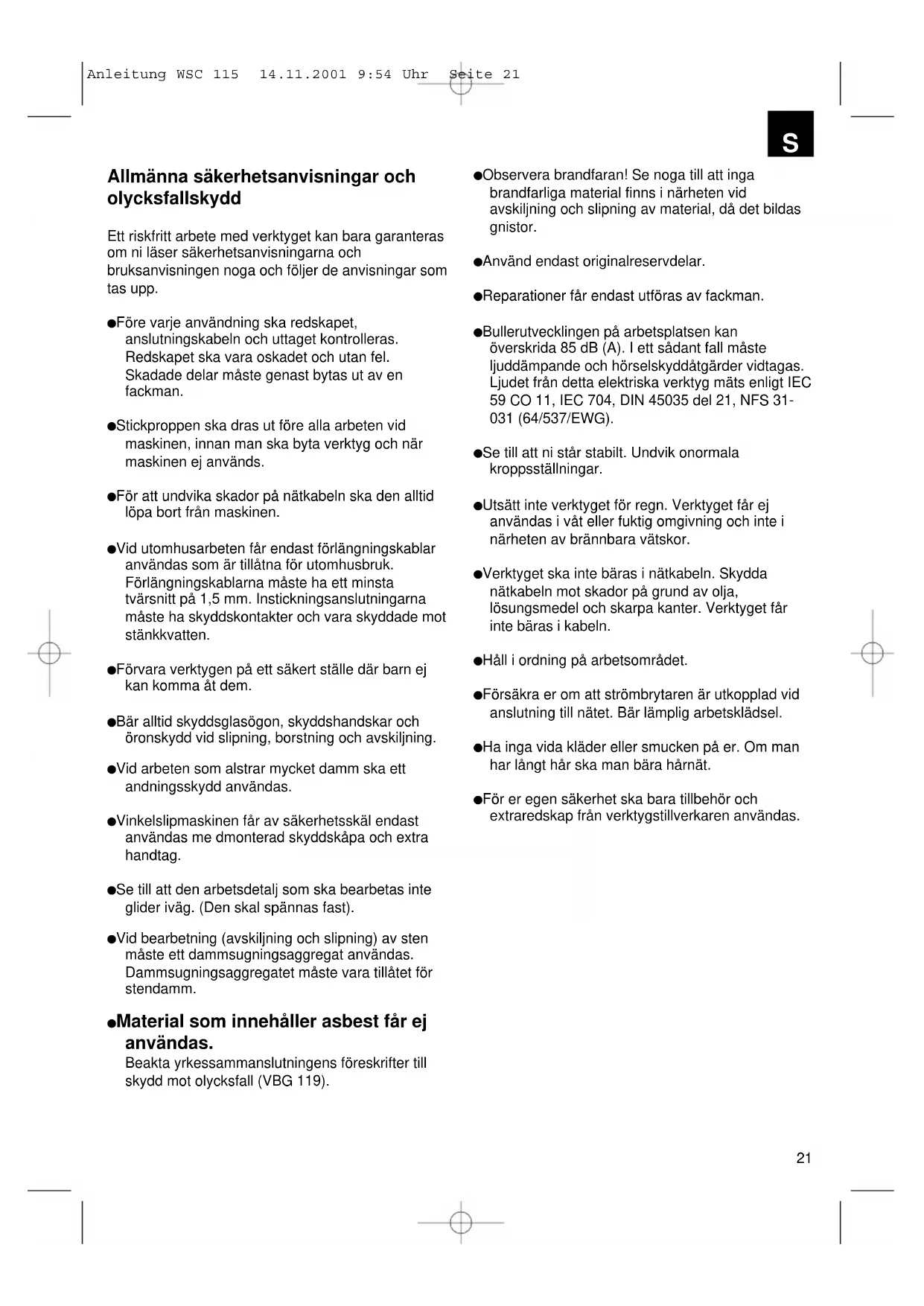 Flange de aperto Porca do flange Disposição dos flanges ao usar-se um rebolo separador recto Anleitung WSC 115 14.11.2001 9:54 Uhr Seite 2021 Allmänna säkerhetsanvisningar och olycksfallskydd Ett riskfritt arbete med verktyget kan bara garanteras om ni läser säkerhetsanvisningarna och bruksanvisningen noga och följer de anvisningar som tas upp. Före varje användning ska redskapet, anslutningskabeln och uttaget kontrolleras. Redskapet ska vara oskadet och utan fel. Skadade delar måste genast bytas ut av en fackman. Stickproppen ska dras ut före alla arbeten vid maskinen, innan man ska byta verktyg och när maskinen ej används. För att undvika skador på nätkabeln ska den alltid löpa bort från maskinen. Vid utomhusarbeten får endast förlängningskablar användas som är tillåtna för utomhusbruk. Förlängningskablarna måste ha ett minsta tvärsnitt på 1,5 mm. Instickningsanslutningarna måste ha skyddskontakter och vara skyddade mot stänkkvatten. Förvara verktygen på ett säkert ställe där barn ej kan komma åt dem. Bär alltid skyddsglasögon, skyddshandskar och öronskydd vid slipning, borstning och avskiljning. Vid arbeten som alstrar mycket damm ska ett andningsskydd användas. Vinkelslipmaskinen får av säkerhetsskäl endast användas me dmonterad skyddskåpa och extra handtag. Se till att den arbetsdetalj som ska bearbetas inte glider iväg. (Den skal spännas fast). Vid bearbetning (avskiljning och slipning) av sten måste ett dammsugningsaggregat användas. Dammsugningsaggregatet måste vara tillåtet för stendamm. Material som innehåller asbest får ej användas. Beakta yrkessammanslutningens föreskrifter till skydd mot olycksfall (VBG 119). Observera brandfaran! Se noga till att inga brandfarliga material finns i närheten vid avskiljning och slipning av material, då det bildas gnistor. Använd endast originalreservdelar. Reparationer får endast utföras av fackman. Bullerutvecklingen på arbetsplatsen kan överskrida 85 dB (A). I ett sådant fall måste ljuddämpande och hörselskyddåtgärder vidtagas. Ljudet från detta elektriska verktyg mäts enligt IEC 59 CO 11, IEC 704, DIN 45035 del 21, NFS 31- 031 (64/537/EWG). Se till att ni står stabilt. Undvik onormala kroppsställningar. Utsätt inte verktyget för regn. Verktyget får ej användas i våt eller fuktig omgivning och inte i närheten av brännbara vätskor. Verktyget ska inte bäras i nätkabeln. Skydda nätkabeln mot skador på grund av olja, lösungsmedel och skarpa kanter. Verktyget får inte bäras i kabeln. Håll i ordning på arbetsområdet. Försäkra er om att strömbrytaren är utkopplad vid anslutning till nätet. Bär lämplig arbetsklädsel. Ha inga vida kläder eller smucken på er. Om man har långt hår ska man bära hårnät. För er egen säkerhet ska bara tillbehör och extraredskap från verktygstillverkaren användas.
