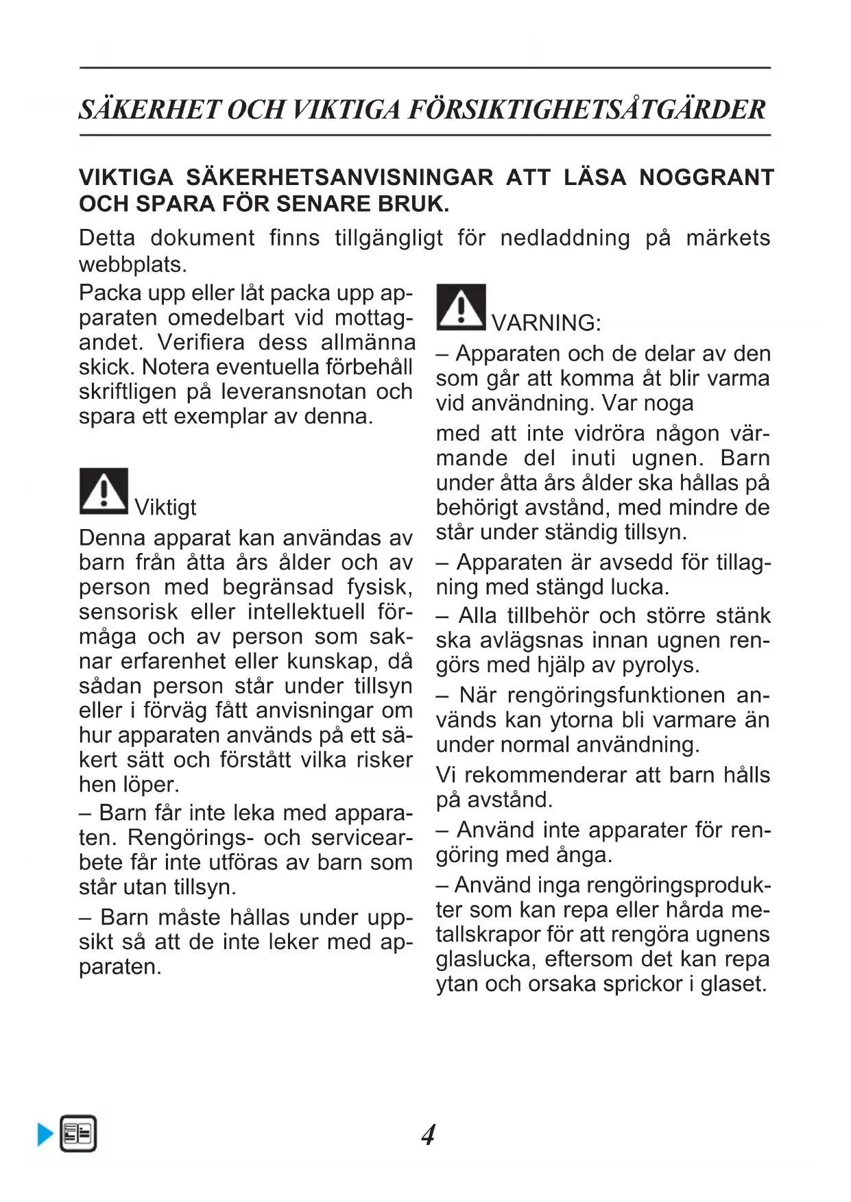 SÄKERHET OCH VIKTIGA FÖRSIKTIGHETSÅTGÄRDER Packa upp eller låt packa upp ap- paraten omedelbart vid mottag- andet. Veriera dess allmänna skick. Notera eventuella förbehåll skriftligen på leveransnotan och spara ett exemplar av denna. Viktigt Denna apparat kan användas av barn från åtta års ålder och av person med begränsad fysisk, sensorisk eller intellektuell för- måga och av person som sak- nar erfarenhet eller kunskap, då sådan person står under tillsyn eller i förväg fått anvisningar om hur apparaten används på ett sä- kert sätt och förstått vilka risker hen löper. – Barn får inte leka med appara- ten. Rengörings- och servicear- bete får inte utföras av barn som står utan tillsyn. – Barn måste hållas under upp- sikt så att de inte leker med ap- paraten. VARNING: – Apparaten och de delar av den som går att komma åt blir varma vid användning. Var noga med att inte vidröra någon vär- mande del inuti ugnen. Barn under åtta års ålder ska hållas på behörigt avstånd, med mindre de står under ständig tillsyn. – Apparaten är avsedd för tillag- ning med stängd lucka. – Alla tillbehör och större stänk ska avlägsnas innan ugnen ren- görs med hjälp av pyrolys. – När rengöringsfunktionen an- vänds kan ytorna bli varmare än under normal användning. Vi rekommenderar att barn hålls på avstånd. – Använd inte apparater för ren- göring med ånga. – Använd inga rengöringsproduk- ter som kan repa eller hårda me- tallskrapor för att rengöra ugnens glaslucka, eftersom det kan repa ytan och orsaka sprickor i glaset. VIKTIGA SÄKERHETSANVISNINGAR ATT LÄSA NOGGRANT OCH SPARA FÖR SENARE BRUK. Detta dokument finns tillgängligt för nedladdning på märkets webbplats.5 SÄKERHET OCH VIKTIGA FÖRSIKTIGHETSÅTGÄRDER VARNING: Undvik eventuell risk för elstöt genom att se till att apparatens strömkabel är frånkopplad innan du byter lampa. Utför bytet när apparaten har svalnat. Använd en gummihandske när du ska skruva loss lampglas och lampa så går det lättare. Det måste gå att koppla ifrån apparaten från elnätet genom att montera en strömbrytare på de fasta ledningskanalerna i enlig- het med installationsbestämmel- serna. – Är nätsladden skadad ska den för att undvika fara bytas av till- verkaren, dennes serviceav- delning eller av personal med motsvarande behörighet. – Som visas i installationsrit- ningen kan apparaten installeras under en bänk eller på höjden. – Centrera ugnen i möbeln så att ett mellanrum på minst 10 mm skiljer den från närmaste möbel. Materialet i inbyggnadsmöbeln ska vara värmebeständigt (eller vara klätt i sådant material). Fäst ugnen i möbeln med två skruvar i härför avsedda hål på sidopos- terna för att den ska stå stadigare. För att undvika överhettning får apparaten inte installeras bakom en skåplucka. – Denna apparat är avsedd att användas för hushålls- och mot- svarande bruk, t.ex. i köksutrym- men avsedda för butikspersonal, kontor och annan yrkesverksam- het, lantgårdar, för att användas av hotell- och motellgäster och i andra miljöer av bostadskaraktär och i miljöer av typ hotellrum. – Ugnen måste vara avstängd vid allt rengöringsarbete inne i ugnen. Ändra inte apparatens egenska- per. Det skulle medföra fara för dig. Använd inte ugnen för förvaring av matvaror eller för att förvara delar i efter användning.6