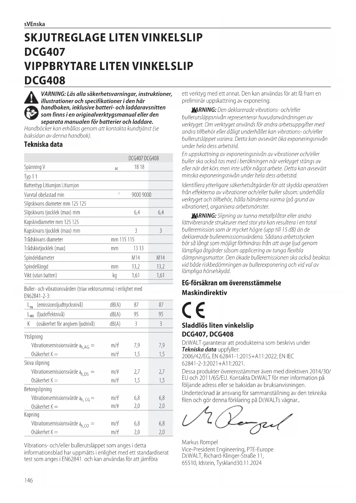 Sladdlös liten vinkelslip DCG407, DCG408 DeWALT garanterar att produkterna som beskrivs under Tekniska data uppfyller: 2006/42/EG, EN 62841‑1:2015+A11:2022; EN IEC 62841‑2‑3:2021+A11:2021.Dessa produkter överensstämmer även med direktiven 2014/30/EU och 2011/65/EU. Kontakta DeWALT för mer information på följande adress eller se baksidan avbruksanvisningen.Undertecknad är ansvarig för sammanställning av den tekniska filen och gör denna förklaring på DeWALTs vägnar..Markus Rompel Vice‑President Engineering, PTE‑Europe DeWALT, Richard‑Klinger‑Straße 11, 65510, Idstein, Tyskland30.11.2024ett verktyg med ett annat. Den kan användas för att få fram en preliminär uppskattning avexponering. VARNING: Den deklarerade vibrations- och/eller bullerutsläppsnivån representerar huvudanvändningen av verktyget. Om verktyget används för andra arbetsuppgifter med andra tillbehör eller dåligt underhållet kan vibrations- och/eller bullerutsläppet variera. Detta kan avsevärt öka exponeringsnivån under hela dessarbetstid.En uppskattning av exponeringsnivån av vibrationer och/eller buller ska också tas med i beräkningen när verktyget stängs av eller när det körs men inte utför något arbete. Detta kan avsevärt minska exponeringsnivån under hela dessarbetstid.Identifiera ytterligare säkerhetsåtgärder för att skydda operatören från effekterna av vibrationer och/eller buller såsom: underhålla verktyget och tillbehör, hålla händerna varma (på grund av vibrationer), organiseraarbetsmönster. VARNING: Slipning av tunna metallplåtar eller andra lättvibrerande strukturer med stor yta kan resultera i en total bulleremission som är mycket högre (upp till 15dB) än de deklarerade bulleremissionsvärdena. Sådana arbetsstycken bör så långt som möjligt förhindras från att avge ljud genom lämpliga åtgärder såsom applicering av tunga flexibla dämpningsmattor. Den ökade bulleremissionen ska också beaktas vid både riskbedömningen av bullerexponering och vid val av lämpligahörselskydd.Vibrations‑ och/eller bullerutsläppet som anges i detta informationsblad har uppmätts i enlighet med ett standardiserat test som anges i EN62841 och kan användas för att jämföra DCG407 DCG408Spänning V 18 18Typ 1 1Batterityp Litiumjon LitiumjonVarvtal obelastad min 9000 9000Slipskivans diameter mm 125 125Slipskivans tjocklek (max) mm 6,4 6,4 Kapskivdiameter mm 125 125Kapskivans tjocklek (max) mm