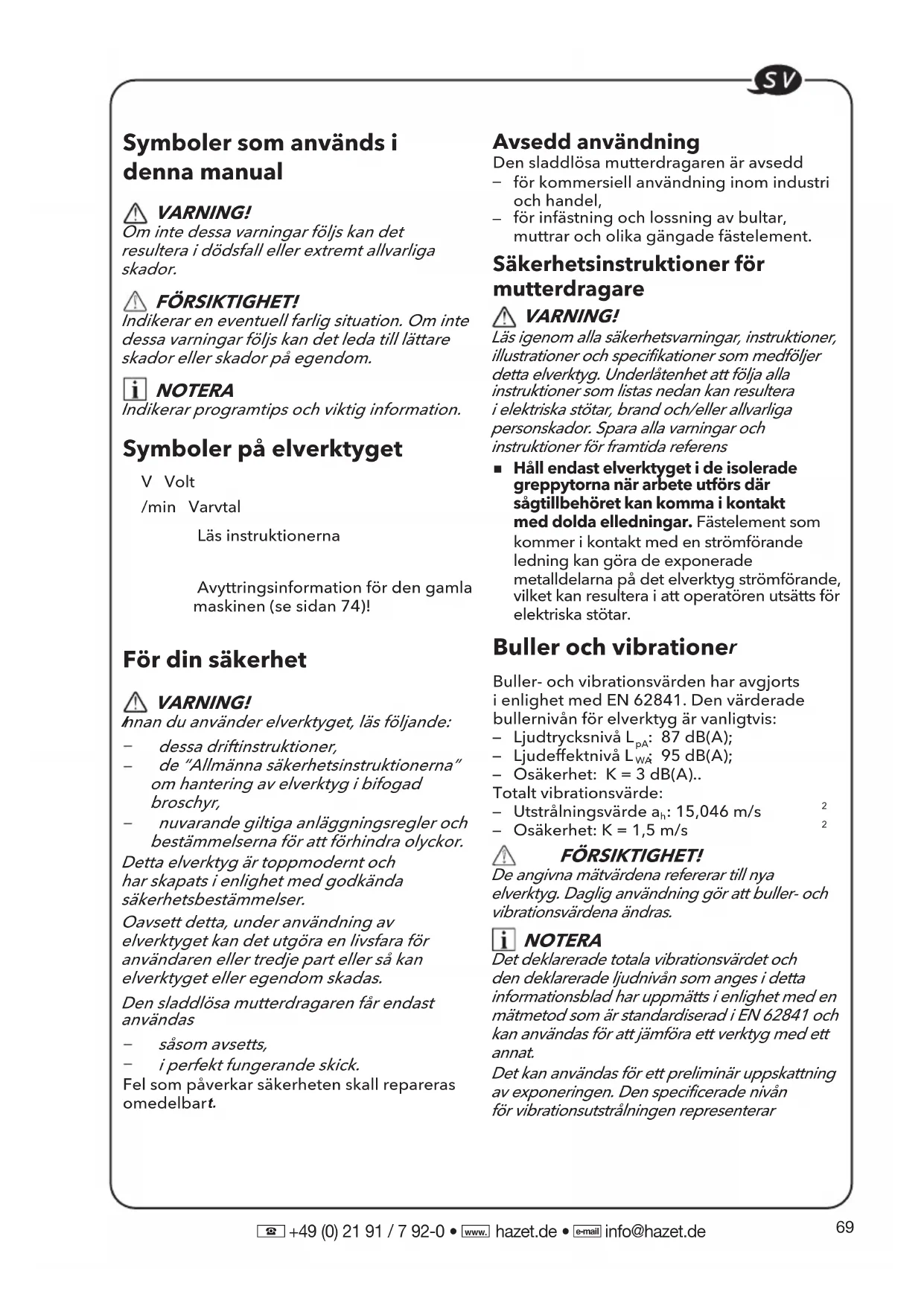 +49 (0) 21 91 / 7 92-0 • hazet.de • info@hazet.de Symboler som används i denna manual VARNING! Om inte dessa varningar följs kan det resultera i dödsfall eller extremt allvarliga skador. FÖRSIKTIGHET! Indikerar en eventuell farlig situation. Om inte dessa varningar följs kan det leda till lättare skador eller skador på egendom. NOTERA Indikerar programtips och viktig information. Symboler på elverktyget V Volt /min Varvtal Läs instruktionerna Avyttringsinformation för den gamla maskinen (se sidan 74)! För din säkerhet VARNING!
