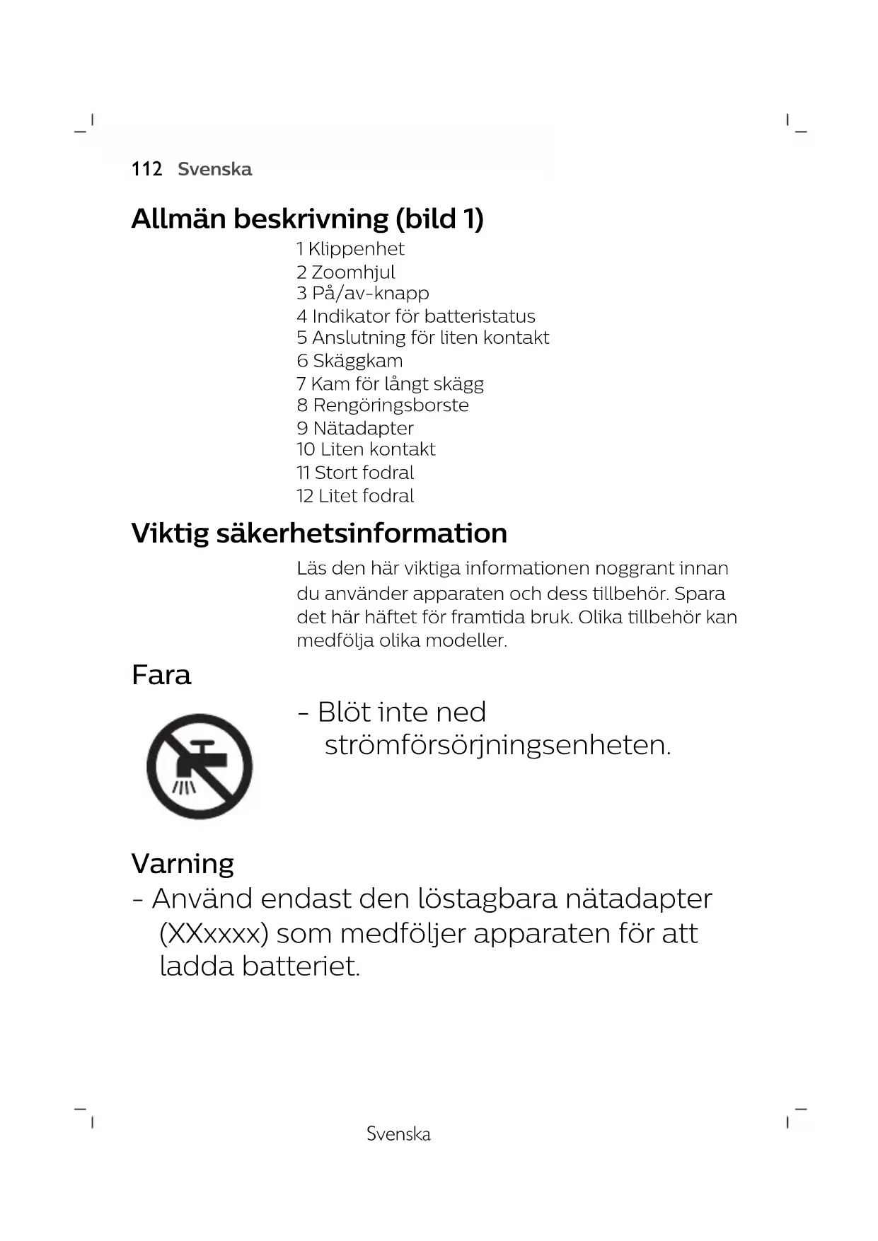 SuomiSvenska Allmän beskrivning (bild 1) 1 Klippenhet 2 Zoomhjul 3 På/av-knapp 4 Indikator för batteristatus 5 Anslutning för liten kontakt 6 Skäggkam 7 Kam för långt skägg 8 Rengöringsborste 9 Nätadapter 10 Liten kontakt 11 Stort fodral 12 Litet fodral Viktig säkerhetsinformation Läs den här viktiga informationen noggrant innan du använder apparaten och dess tillbehör. Spara det här häftet för framtida bruk. Olika tillbehör kan medfölja olika modeller. Fara - Blöt inte ned strömförsörjningsenheten. Varning - Använd endast den löstagbara nätadapter (XXxxxx) som medföljer apparaten för att ladda batteriet.