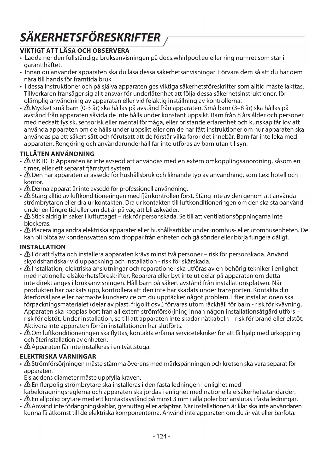 VARNING: Försäkra dig om att apparaten är avstängd och bortkopplad från elnätet innan något underhållsarbete påbörjas. Använd skyddshandskar (risk för sårbildning) och skyddsskor (risk för blåmärken) för att undvika risk för personskada. Se till att hantera enheten med två personer (minska belastningen). Använd aldrig ångtvätt (risk för elstöt). Spruta inte in vatten i enheten - risk för elektrisk stöt. Rör inte vid änsarna på inomhusenheten med ngrarna efter att ha tagit bort ltret och försök inte att rengöra luftkonditioneringens insida själv - risk för personskada. Icke- professionella reparationer som inte har godkänts av tillverkaren kan leda till en risk för hälsa och säkerhet som tillverkaren inte kan hållas ansvarig för. Eventuella fel eller skador orsakade av icke- professionella reparationer eller icke-professionellt underhåll täcks inte av garantin, vars villkor beskrivs i dokumentet som levererades med enheten.