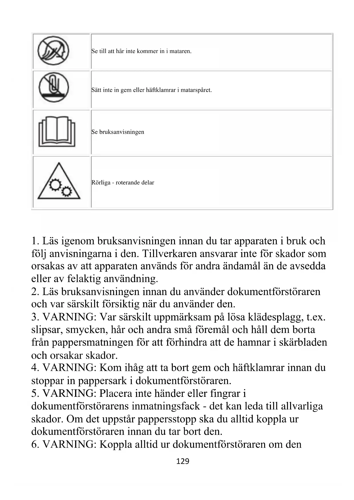 6. VARNING: Koppla alltid ur dokumentförstöraren om den130