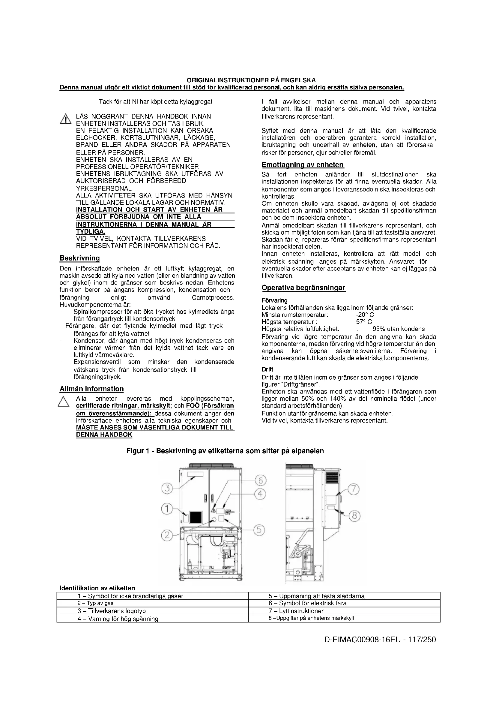 Identifikation av etiketten 1 – Symbol för icke brandfarliga gaser 5 – Uppmaning att fästa sladdarna 2 – Typ av gas 6 – Symbol för elektrisk fara 3 – Tillverkarens logotyp 7 – Lyftinstruktioner 4 – Varning för hög spänning 8 –Uppgifter på enhetens märkskyltD-EIMAC00908-16EU - 118/250