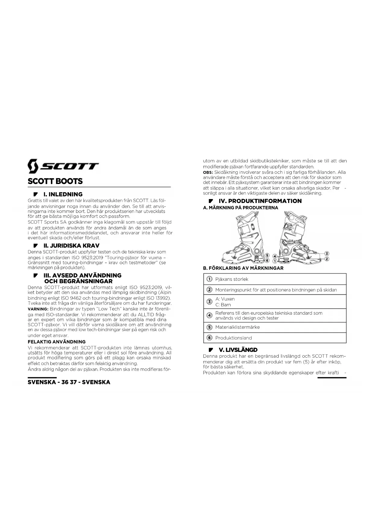 Denna SCOTT-produkt har utformats enligt ISO 9523:2019, vil- ket betyder att den ska användas med lämplig skidbindning (Alpin bindning enligt ISO 9462 och touring-bindningar enligt ISO 13992). Tveka inte att fråga din vänliga återförsäljare om du har funderingar. VARNING : Bindningar av typen ”Low Tech” kanske inte är förenli- ga med ISO-standarder. Vi rekommenderar att du ALLTID fråg- ar en expert om vilka bindningar som är kompatibla med dina SCOTT-pjäxor. Vi vill därför varna skidåkare om att användning