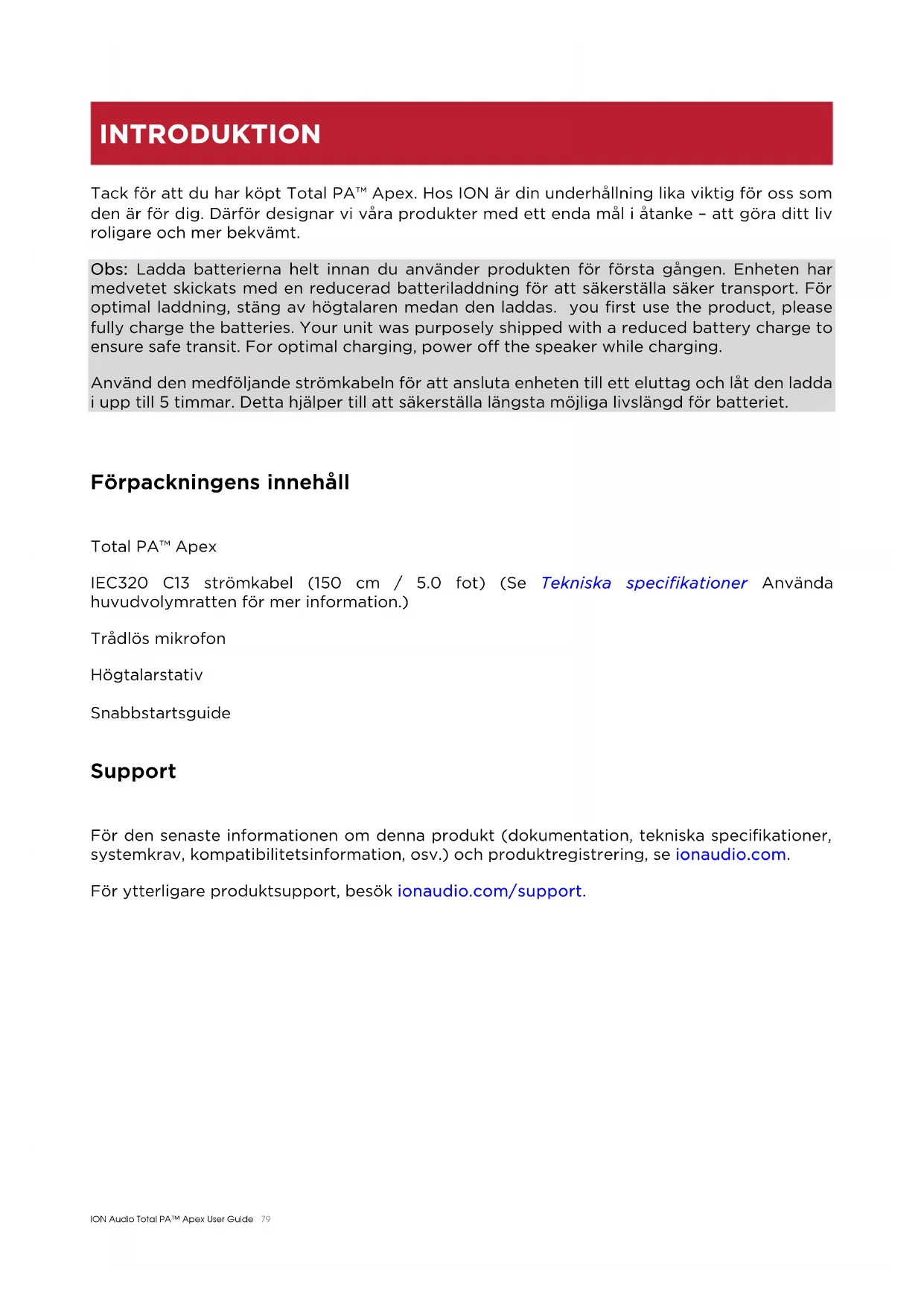 INTRODUKTIONION Audio Total PA™ Apex User Guide 80 Laddning och batteriinformation För snabbast möjliga laddningstid, stäng av Total PA™ Apex och använd den medföljande strömkabeln för att ansluta högtalaren till ett eluttag. En full laddning kan ta upp till 5 timmar.