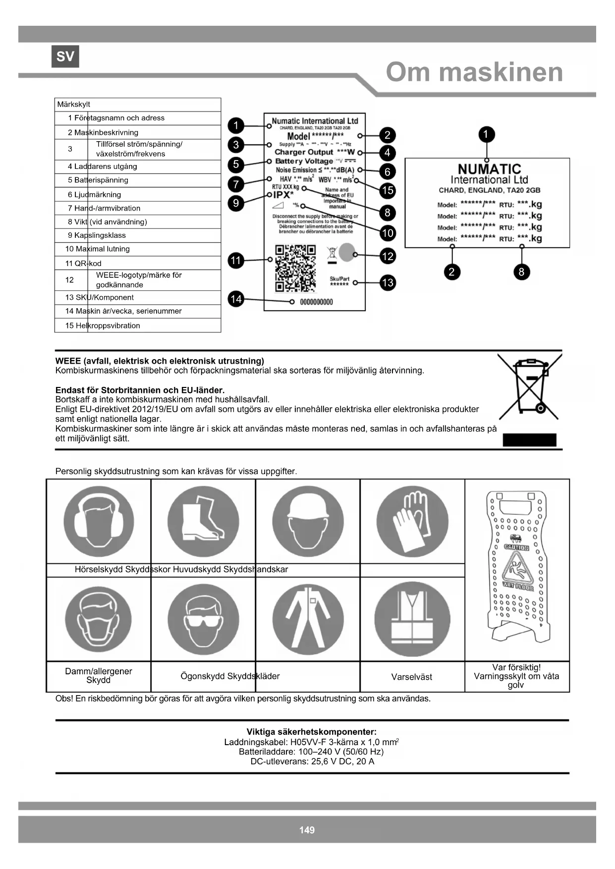 Batteriladdare: 100–240 V (50/60 Hz) DC-utleverans: 25,6 V DC, 20 A Hörselskydd Skyddsskor Huvudskydd Skyddshandskar Damm/allergener Skydd Ögonskydd Skyddskläder Varselväst Var försiktig! Varningsskylt om våta golv Personlig skyddsutrustning som kan krävas för vissa uppgifter. Obs! En riskbedömning bör göras för att avgöra vilken personlig skyddsutrustning som ska användas. Märkskylt1 Företagsnamn och adress2 Maskinbeskrivning Tillförsel ström/spänning/växelström/frekvens4 Laddarens utgång5 Batterispänning6 Ljudmärkning7 Hand-/armvibration8 Vikt (vid användning)9 Kapslingsklass10 Maximal lutning11 QR-kod WEEE-logotyp/märke för godkännande13 SKU/Komponent14 Maskin år/vecka, serienummer15 Helkroppsvibration