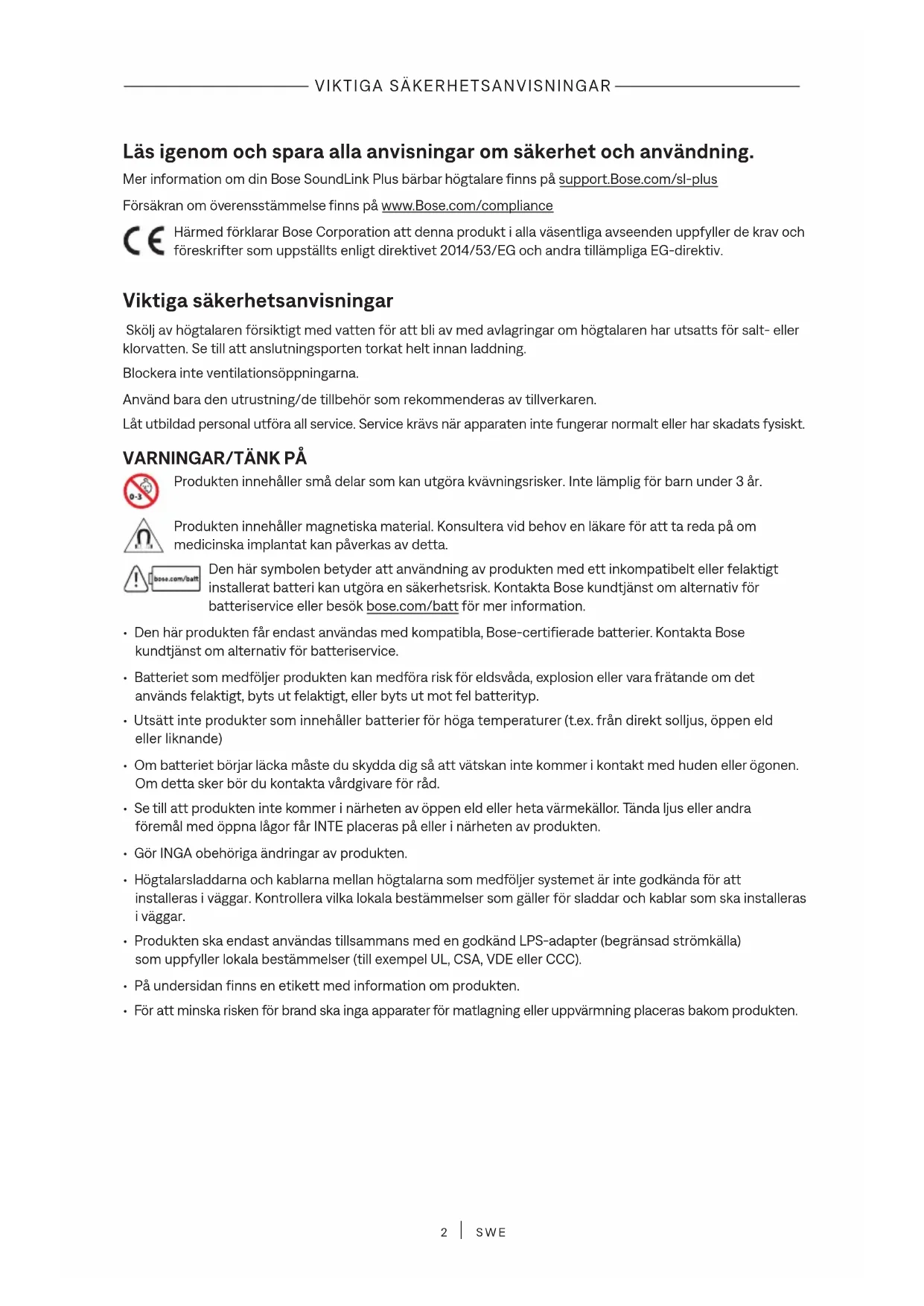 SWE Läs igenom och spara alla anvisningar om säkerhet och användning. Mer information om din Bose SoundLink Plus bärbar högtalare finns på support.Bose.com/sl-plussupport.Bose.com/sl-plus Försäkran om överensstämmelse finns på www.Bose.com/compliancewww.Bose.com/compliance Härmed förklarar Bose Corporation att denna produkt i alla väsentliga avseenden uppfyller de krav och föreskrifter som uppställts enligt direktivet 2014/53/EG och andra tillämpliga EG-direktiv. Viktiga säkerhetsanvisningar Skölj av högtalaren försiktigt med vatten för att bli av med avlagringar om högtalaren har utsatts för salt- eller klorvatten. Se till att anslutningsporten torkat helt innan laddning. Blockera inte ventilationsöppningarna. Använd bara den utrustning/de tillbehör som rekommenderas av tillverkaren. Låt utbildad personal utföra all service. Service krävs när apparaten inte fungerar normalt eller har skadats fysiskt.