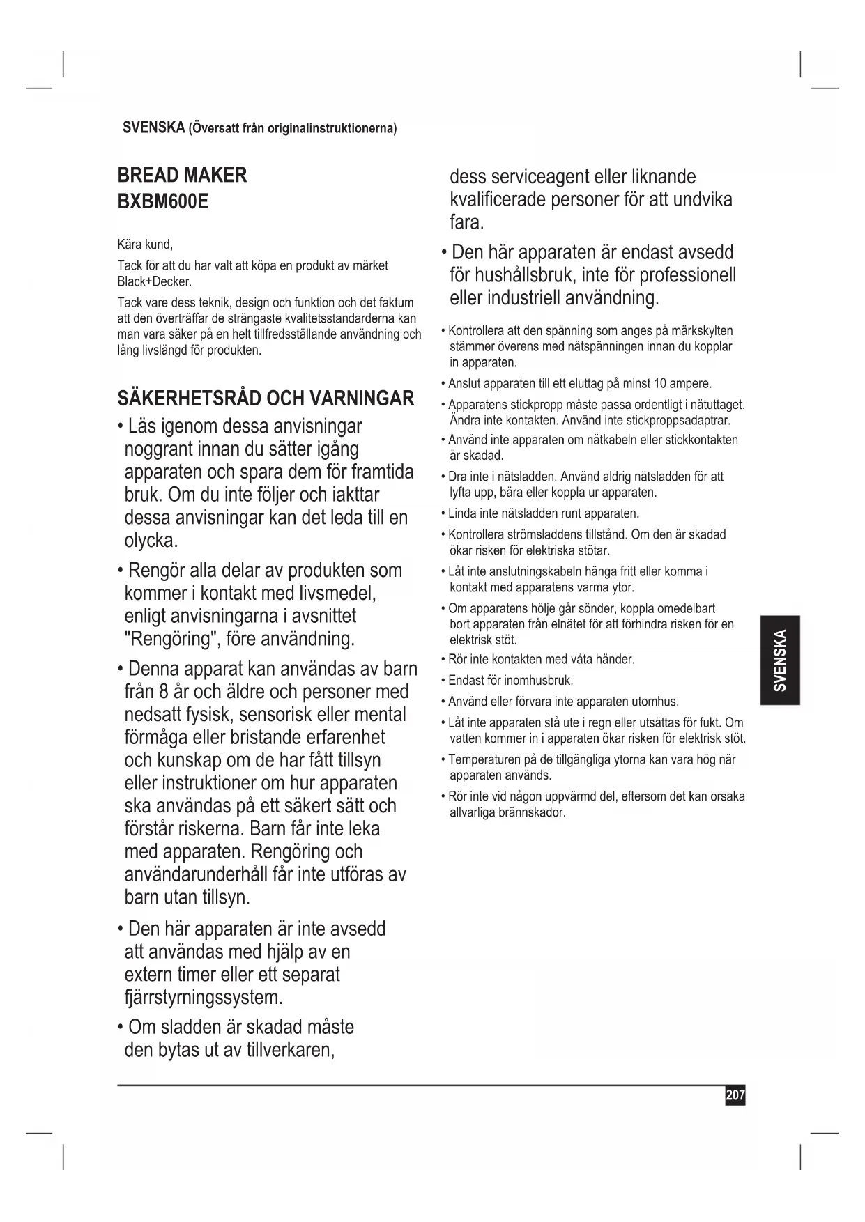Brödet har en krater i toppen av limpan när det gräddats. Degen har jäst för snabbt. För mycket jäst eller vatten. Felaktigt program valdes för receptet. Öppna inte locket under bakningen. Välj en mörkare skorpa. Skorpan är för ljus. Öppna locket under bakning. Öppna inte locket under bakningen. Välj en mörkare skorpa. Skorpan har för mörk färg. För mycket socker i receptet. Minska sockermängden något. Välj en lättare skorpa. Brödlimpan är skev. För mycket jäst eller vatten. Mät upp alla ingredienser noggrant. Minska jästen eller vattnet något. Röran skjuts åt sidan innan den jäser och gräddas. Vissa bröd kan få en ojämn form, särskilt om de bakas med fullkorns- mjöl. Bröden har olika form. Varierar beroende på typ av bröd. Fullkornsbröd eller erkornsbröd är tätare och kan vara kortare än vitt bröd. Botten är ihålig eller hålig inuti. För blöt deg, för mycket jäst, för lite salt. Mät upp alla ingredienser noggrant Minska jästen eller vattnet något. Kontrollera saltmätningen. Vattnet är för varmt. Använd rumstempererat vatten. Underbakat eller kladdigt bröd. För mycket vätska; felaktigt program valt. Minska vätskan och mät ingredien- serna noggrant. Kontrollera vilket program som valts för receptet. Bröd mosas ner vid skivning. Brödet är för varmt. Låt svalna på ett galler i 15-30 minuter innan den skärs i skivor. Bröd har en tung, tjock kon- sistens. För mycket mjöl, gammalt mjöl. Inte tillräckligt med vatten. Prova att öka mängden vatten eller minska mängden mjöl. Fullkornsbröd får en tyngre kon- sistens. Botten på brödfatet har mörknat eller är äckig. Efter tvätt i diskmaskin. Detta är normalt och kommer inte att påverka brödfatet.221 SUOMALAINEN SUOMALAINEN (Alkuperäisten ohjeiden käännös) LEIPÄKONE BXBM600E Hyvä asiakas, Suuret kiitokset siitä, että valitsit Black+Decker-merkkisen tuotteen. Sen tekniikan, suunnittelun ja toiminnan sekä sen ansiosta, että se ylittää tiukimmat laatuvaatimukset, voidaan taata täysin tyydyttävä käyttö ja pitkä käyttöikä. TURVALLISUUSOHJEET JA VAROITUKSET