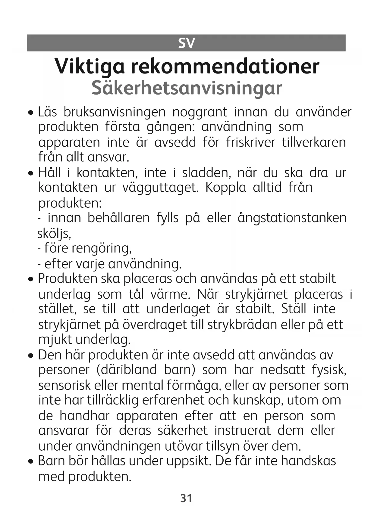 1800131945 GV52XX E0_110x154 22/11/13 09:27 Page31• Denna produkt får användas av barn från åtta år och uppåt och personer som har nedsatt fysisk, sensorisk eller mental förmåga, eller av personer som inte har tillräcklig erfarenhet och kunskap, utom om de handhar apparaten efter att en person som ansvarar för deras säkerhet instruerat dem att använda produkten på ett säkert sätt och är införstådda med de risker som kan uppstå. Barn får inte leka med produkten. Rengöring och underhåll får inte utföras av barn under åtta år utan tillsyn. Håll produkten och sladden utom räckhåll för barn under åtta år.