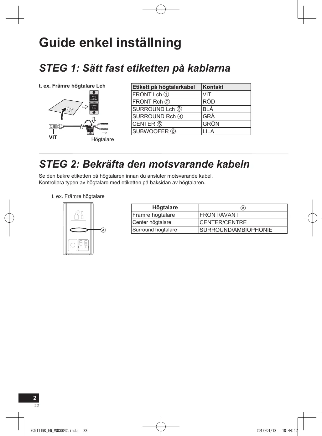2012/01/12 10:44:17 Guide enkel inställning STEG 1: Sätt fast etiketten på kablarna t. ex. Främre högtalare Lch FRONT Lch