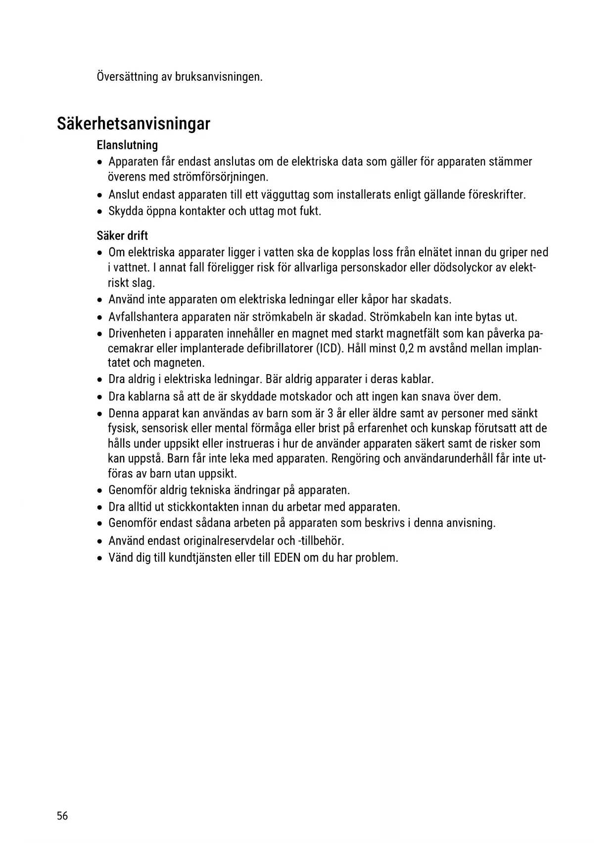 Översättning av bruksanvisningen. Säkerhetsanvisningar Elanslutning