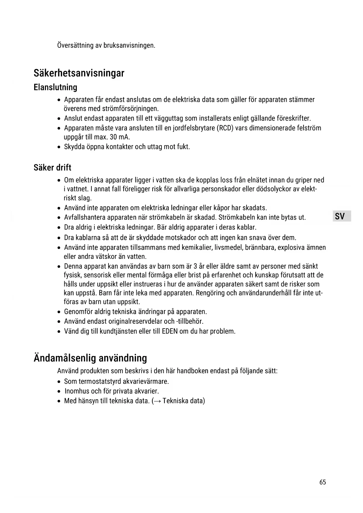 - Vänd dig till kundtjänsten eller till EDEN om du har problem. Ändamålsenlig användning Använd produkten som beskrivs i den här handboken endast på följande sätt: