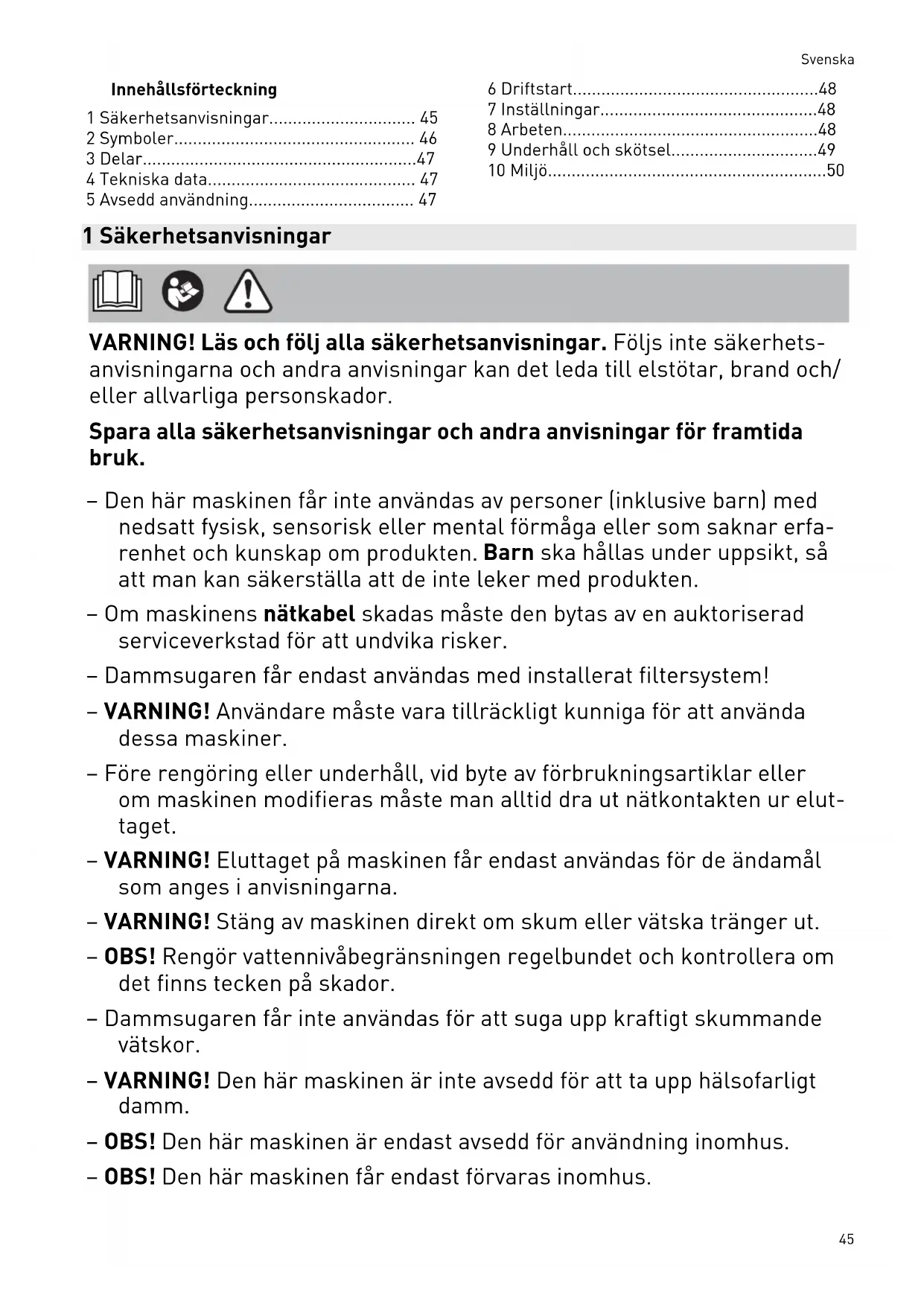 - 10 Miljö 1 Säkerhetsanvisningar VARNING! Läs och följ alla säkerhetsanvisningar. Följs inte säkerhets anvisningarna och andra anvisningar kan det leda till elstötar, brand och/ eller allvarliga personskador. Spara alla säkerhetsanvisningar och andra anvisningar för framtida bruk. – Den här maskinen får inte användas av personer (inklusive barn) med nedsatt fysisk, sensorisk eller mental förmåga eller som saknar erfa renhet och kunskap om produkten. Barn ska hållas under uppsikt, så att man kan säkerställa att de inte leker med produkten. – Om maskinens nätkabel skadas måste den bytas av en auktoriserad serviceverkstad för att undvika risker. – Dammsugaren får endast användas med installerat filtersystem! – VARNING! Användare måste vara tillräckligt kunniga för att använda dessa maskiner. – Före rengöring eller underhåll, vid byte av förbrukningsartiklar eller om maskinen modifieras måste man alltid dra ut nätkontakten ur elut taget. – VARNING! Eluttaget på maskinen får endast användas för de ändamål som anges i anvisningarna. – VARNING! Stäng av maskinen direkt om skum eller vätska tränger ut. – OBS! Rengör vattennivåbegränsningen regelbundet och kontrollera om det finns tecken på skador. – Dammsugaren får inte användas för att suga upp kraftigt skummande vätskor. – VARNING! Den här maskinen är inte avsedd för att ta upp hälsofarligt damm. – OBS! Den här maskinen är endast avsedd för användning inomhus. – OBS! Den här maskinen får endast förvaras inomhus. Svenska 45– Explosions- och brandfara! Sug inte upp: – gnistor, glödande partiklar eller varmt damm; – brandfarliga eller explosiva ämnen (t.ex. magnesium, aluminium, bensin, förtunning); – starka ämnen (t.ex. syra, lut, lösningsmedel); – ämnen som kan reagera kemiskt och bilda värme, syror/baser, gaser osv. (exempelvis reaktiva tvåkomponentsmaterial, aluminium och vatten). – Nationella säkerhetsföreskrifter samt materialtillverkarens anvis ningar ska följas! – Får endast användas tillsammans med lämplig skyddsutrustning! – Får endast användas efter att man kontrollerat visuellt att den är hel, i torr miljö och efter instruktion! – Kontrollera kontakten, eluttaget, kabeln och filtret regelbundet för att undvika fara. Skadade elkomponenter måste alltid bytas ut av en auktoriserad serviceverkstad. – Dammsugaren ska endast bäras i det avsedda handtaget. – Får inte lyftas eller transporteras med lyftkrok eller telfer. – Dammsugaren får inte bäras i sugslangsfästet [1-3]! – Ställ maskinen på jämnt underlag och säkra den så att den inte kan rulla iväg. – Denna maskin får inte användas av personer som kan reagera extra känsligt på elstötar (t.ex. personer med pacemaker), eftersom statisk uppladdning av maskinen inte kan uteslutas. – Använd endast originalsugslangen från Festool. – Observera arbetsmiljön och var rädd om dig själv och andra när maskinen transporteras och används. Se till exempel till att ingen kan snubbla på sugslangen eller nätka beln. – Håll förpackningsplasten borta från barn. Det finns risk för kvävning. 2 Symboler Varning för allmän risk Varning för elstötar Läs bruksanvisningen och säkerhets anvisningarna! Kasta den inte i hushållssoporna. Dra ut nätkontakten Använd andningsskydd. Svenska 46Förbjudet att kliva upp Tips, information CE-märkning om överensstämmelse Bruksanvisning 3 Delar [1-1] Eluttag [1-2] Kabel- och tillbehörsdepå [1-3] Sugslangsfäste [1-4] Handtag [1-5] Låsning [1-6] Filterlåda [1-7] Låsklämma [1-8] Utblås [1-9] Smutsbehållare [1-10] Strömbrytare [1-11] MAN-knapp [1-12] Reglage för sugeffekt De angivna bilderna finns i början av bruksan visningen. 4 Tekniska data Dammsugare CT15 CT25 Effekt 350 - 1200W Anslutningseffekt i eluttag max. EU CH, DK p. 50