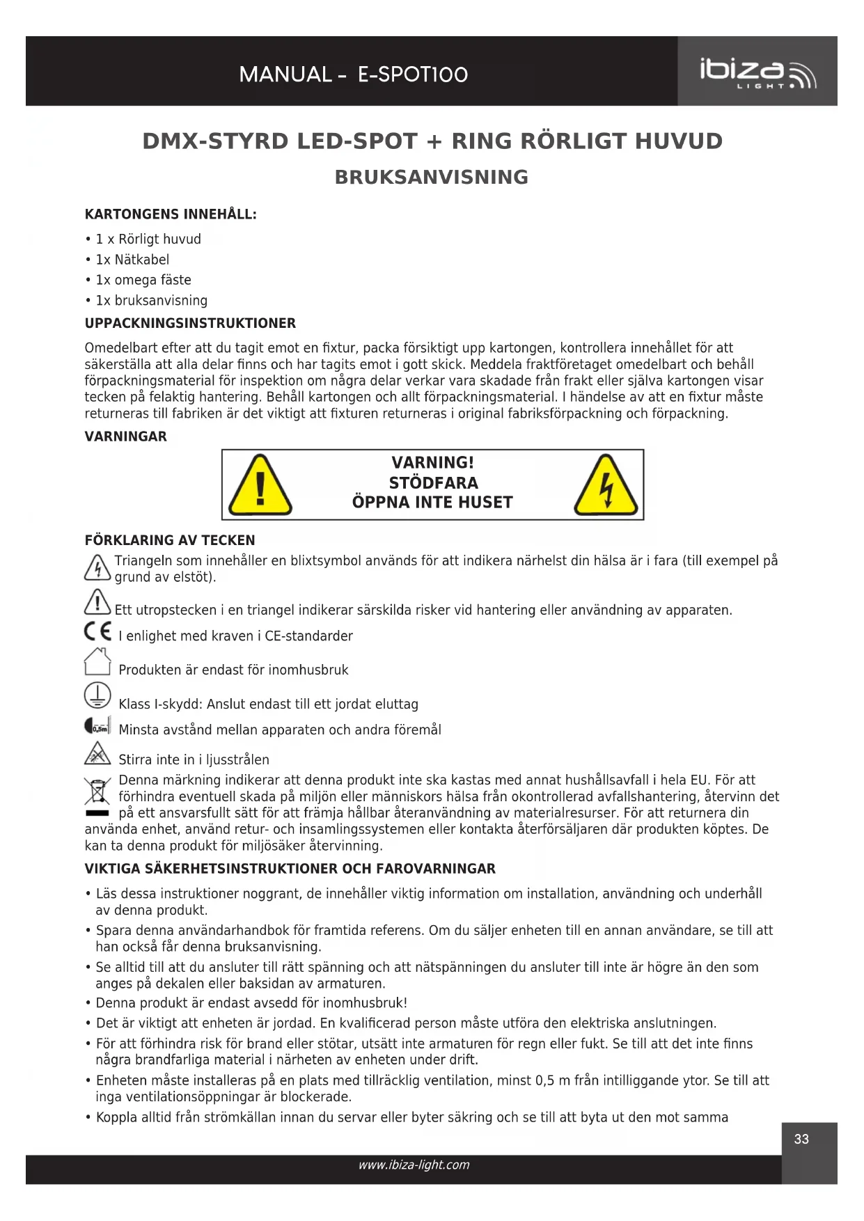 Triangeln som innehåller en blixtsymbol används för att indikera närhelst din hälsa är i fara (till exempel på grund av elstöt). Ett utropstecken i en triangel indikerar särskilda risker vid hantering eller användning av apparaten. I enlighet med kraven i CE-standarder Produkten är endast för inomhusbruk Klass I-skydd: Anslut endast till ett jordat eluttag 0.5m Minsta avstånd mellan apparaten och andra föremål Stirra inte in i ljusstrålen Denna märkning indikerar att denna produkt inte ska kastas med annat hushållsavfall i hela EU. För att förhindra eventuell skada på miljön eller människors hälsa från okontrollerad avfallshantering, återvinn det på ett ansvarsfullt sätt för att främja hållbar återanvändning av materialresurser. För att returnera din använda enhet, använd retur- och insamlingssystemen eller kontakta återförsäljaren där produkten köptes. De kan ta denna produkt för miljösäker återvinning.
